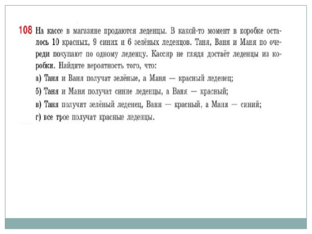 Из ящика, содержащего 4 красных , 6 зеленых , и 5 синих шаров наудачу последовательно извлекают 3 шара. Найти вероятность того, что первым будет извлечён красный шар, вторым – зелёный и третьим – синий (извлечённые шары обратно в ящик не возвращаются).