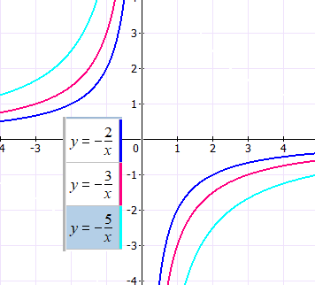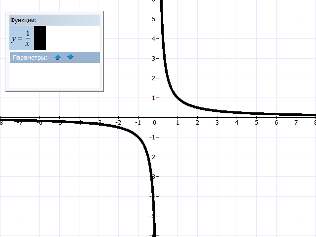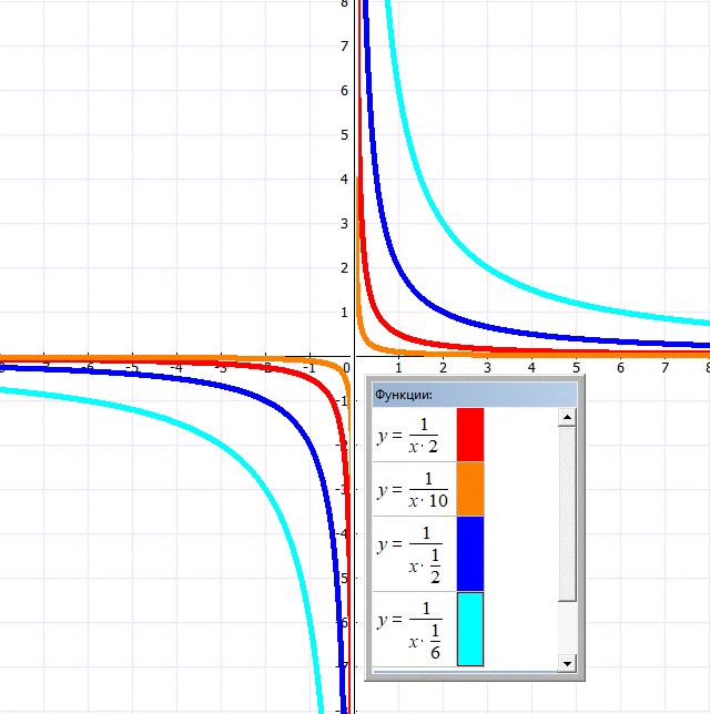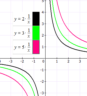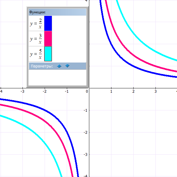 Гипербола — это график функции обратной пропорциональности, которая задается следующей формулой: y = k/x, где: x — независимая переменная, k — коэффициент пропорциональности. При этом k≠0. При k0 график расположен в 1 и 3 четвертях координатной плоскости (функция убывает), при k