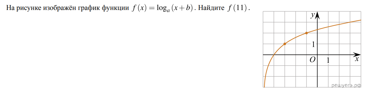 По графику можно сразу сказать, что b = 5, так как для графика выполнен параллельный перенос, вдоль оси OX на 5. И точка имеющая стандартные координаты для любой логарифмической функции(1; 0), теперь имеет координату (-4; 0). А при параллельном переносе любой функции влево вдоль оси OX, b 0. Теперь подставим в получившуюся функцию координаты любой точки графика(-1; 2). 2 = loga(-1 + 5). 2 = loga4. loga4 = 2. a = 2. y = log2(x + 5). Теперь подставим 11 в качестве значения x. y = log216. y = 4. Таким образом, f(11) = 4