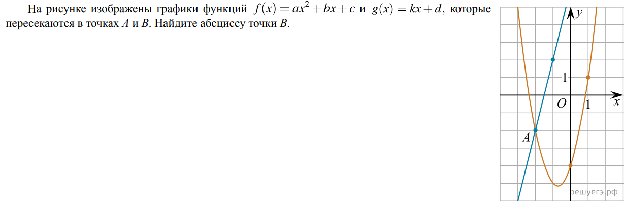 2x2 + 3x – 4 = 4x + 6. 2x2 – x – 10 = 0. x1 = 2,5 x2 = -8 / 4 = -2. X1 – это как раз точка, которую обозначил автор. А X2 – это абсцисса точки, которая за пределами рисунка., то есть точки B. Ответ: 2,5