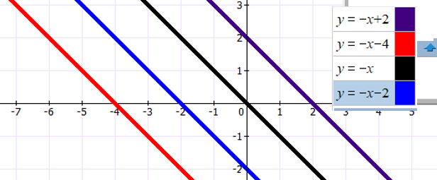 Теперь определим уравнение второй(синей) прямой. Она проходит через точки (-1; 2) и (2; -1). Это стандартную функцию у=-х сдвинули по оси ОУ вверх на 1.Таким образом, уравнение второй прямой – y = -x +1.