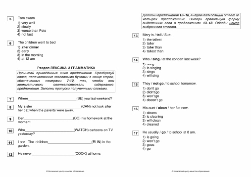 В заданиях 7-12 проверяются грамматические навыки учащихся. Учащиеся определяют правильный ответ путём преобразования предлагаемых слов в правильную форму для каждого пропуска.