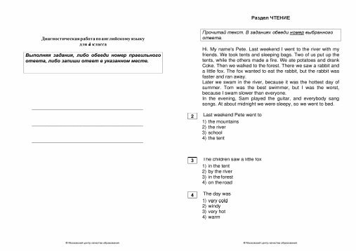 Диагностическая работа проводится с целью определения уровня подготовки учащихся 4-х классов по английскому языку.