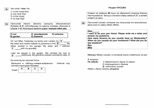 Задание 20 проверяет умение давать запрашиваемую информацию в личном письме. Учащимся необходимо прочитать письмо от английского друга (подруги) и ответить на его (её) вопросы. Задание 20 оценивается по критериям.