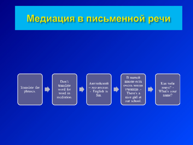 В данной презентации демонстрируется немного теоретических знаний о медиации, а также предложены задания на медиацию : подобрать эквиваленты на русском языке к английским фразам и составить диалог на русском языке по письму на английском языке.