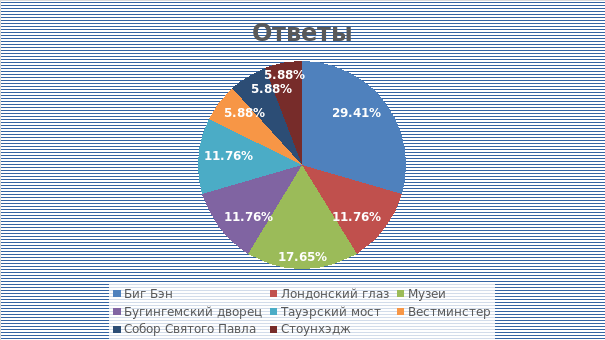 С целью подтверждения актуальности темы моего проекта, я провела опрос среди моих знакомых. Из 16 человек, 5 больше всего хотят посетить «Биг Бэн», 2 покататься на колесе обозрения «Лондонский Глаз», 3 посетить музеи Лондона, еще 2«Букингемскийдворец», 2 пройтись по Тауэрскому мосту, 1 «Вестминстер» , 1 «Собор Святого Павла», 1 «Стоунхэдж». Все мои знакомые очень хотели бы посетить достопримечательности Лондона и из этого можно сделать вывод то, что достопримечательности Лондона актуальны по сей день.