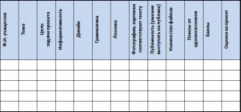 Данная таблица помогает отслеживать результаты выполнения проектов в классе, если проект выполнен в виде презентации. Учащиеся могут выразить своё отношение к проектам одноклассников, проголосовать за понравившийся проект, узнать много нового не только по изучаемой теме, но и об увлечения одноклассники. Для учащихся предлагается тема, а названия проектов они выбирают сами.