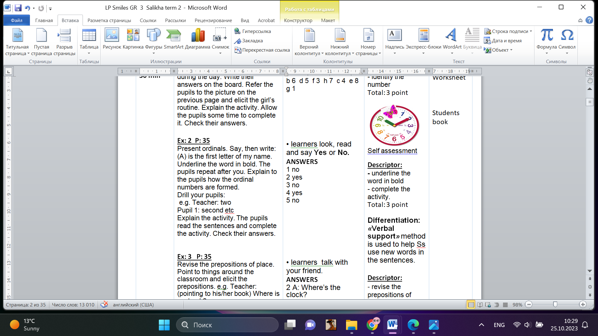 | Beginning of the lesson Warming-up 3 min Pre-learning «Brainstorming» method 7 min. | Organization moment : 1.Greeting. Ask about the weather. The teacher sets the lesson objectives, letting students know what to anticipate from the lesson. Warming up Where are you from? How old are you? What color is it? How many students are there in class? What day of the week today? Revise the vocabulary from the previous lesson Lead – In | The aim: To develop pupils speaking skills and create friendly atmosphere Efficiency: By wishing each other they feel better and feel the support of others Students of the class are listed. Students' attention is drawn to the lesson. • Learners talk about days of the week previous lesson vocabulary Determines the topic and purpose of the lesson Students say different words from the picture | The teacher to assess learners for their ability. “Good job! Well done!” Formative Assessment Good job! Descriptor: - talk about days of the we Total: 1 point Assessment criteria - Learners have met the learning objectives if they can talk about your last I holidays. | Pictures worksheet picture |