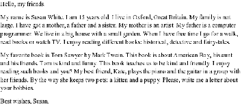 5). So, I see that you know a lot of hobbies people have. The other day I received a letter from Great Britain. Susan, an English girl, wrote us about hobbies of English children. So, I made some copies of Susan`s letter. The task for you is to read and translate the letter carefully. Be ready to discuss it.