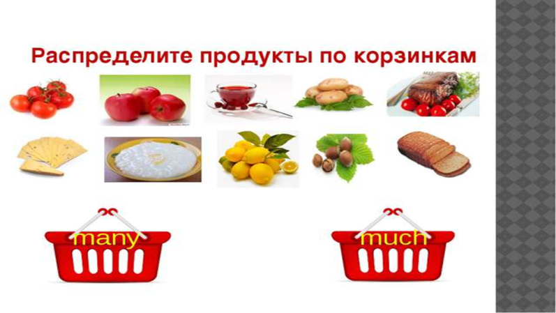 | 7.Первичное закрепление новых знаний | В группах | Divide these products into 2 baskets. Распредели эти продукты по двум корзинкам (Слайд 8) | Работают в группах, продумывают вопросы и ответные реплики. Учатся речевому взаимодействию в группе. | – структурирование знаний (П); – выполнение пробного учебного действия (Р); саморегуляция в ситуации затруднения (Р); - актуализация ранее приобретённых знаний (П) и попытка применения новых знаний (П, К, Р) |