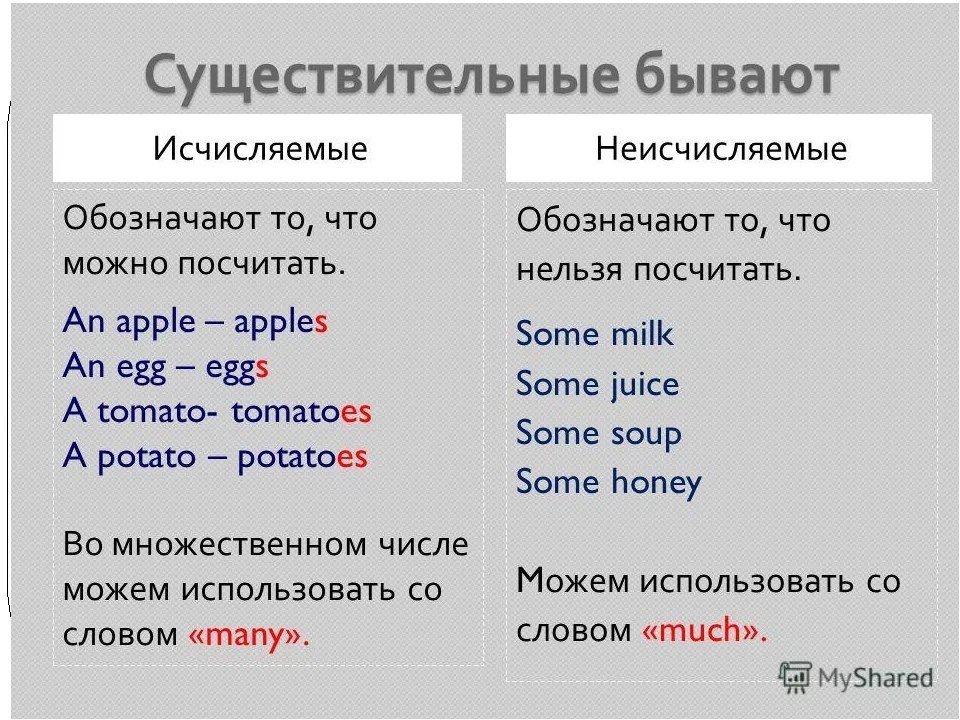 | 6. Первичная проверка понимания | Индивидуально, в парах, фронтально | Countable and uncountable nouns. Исчисляемые и неисчисляемые существительные. (Слайд 7) Детям предлагается пластилин и они предлагается вылепить и посчитать. Такие существительные называются исчисляемыми. Одно яблоко-два яблока Одно яйцо-два яйца Один помидор-два помидора Один картофель-два картофеля А затем детям предлагается вылепить молоко, сок, суп, свет, дружбу. Их невозможно вылепить и посчитать. Такие существительные называются неисчисляемыми. Способствует осознанному пониманию содержания. Обращает внимание на незнакомые слова. | Воспринимают текст на слух, делают познавательный выбор при чтении текста. Выполняют задание по поиску запрашиваемой информации. Проверяют свои ответы. Самостоятельно и в парах решают познавательную задачу. | -прослушивание, чтение, речевое взаимодействие (К) - анализ информации, с целью установления соответствия между предложенными утверждениями и информацией в тексте (П). -осуществление выбора при решении коммуникативной задачи, оценка результата своей деятельности (Р) - планирование учебного сотрудничества в паре (К); – использование знаково- символических средств (П). |