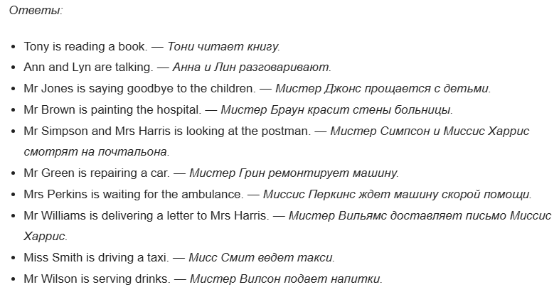 Сейчас запишите домашнее задание: упр.11 стр.79. Вам нужно найти любую картинку в интернете и описать, какие действия выполняют люди.