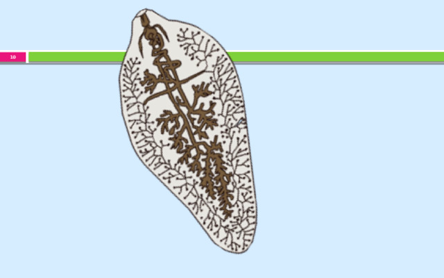 Печеночный сосальщик живет в протоках печени рогатого скота. Его р азвитие включает смену хозяев и чередование поколений.