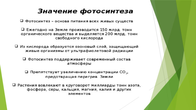 Подчеркнуть значение фотосинтеза в природе и жизни человека