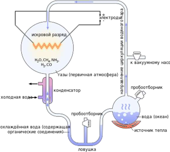 В один из резервуаров установки помещается смесь газов (водорода, аммиака, метана и водяных паров), которые входили в состав первичной атмосферы. Через эту смесь при помощи электродов пропускаются электрические