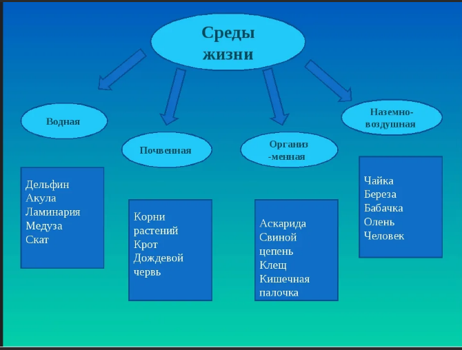 Первичное освоение учебного материала | Физкультминутка: «Гимнастика для глаз» 1.Просмотреть видеофрагмент, дополнить таблицу недостающими данными 2.Проверка заполнения таблицы Среды обитания живых организмов Название среды | условия | Приспособления у организмов | кислород | вода | Температура | свет | водная | Мало, растворен в воде | много | Без резких колебаний | Чем глубже, тем меньше | Обтекаемая форма тела, конечности- плавники, ласты. Придонные животные- уплощенная форма тела. | Наземно-воздушная | достаточно | Количество зависит от климата | Резкие перепады | много | Обитатели пустынь: растения- глубокая корневая система, узкие листья или колючки; животные- летняя спячка, метаболическая вода. | почвенная | мало | Зависит от осадков и времен года | Более постоянна, чем на поверхности | нет | тело покрытое слизью- у дождевого червя, у землеройки и крота тело вытянутое, овальное покрыто мягкой шерстью. Зрение практически отсутствует | организменная | недостаточно | нет | постоянная | нет | Специальные приспособления для паразитического образа жизни | | Ответы обучающихся | Личностные: уважительное отношение к иному мнению Познавательные: умения доказывать, аргументировать свою точку зрения Коммуникативные: понимать на слух ответы обучающихся Регулятивные: по мере необходимости исправляют, уточняют, дополняют ответы. Предметные: называть представителей и характеризовать условия обитания в разных средах жизни. | Приложение 2 |
