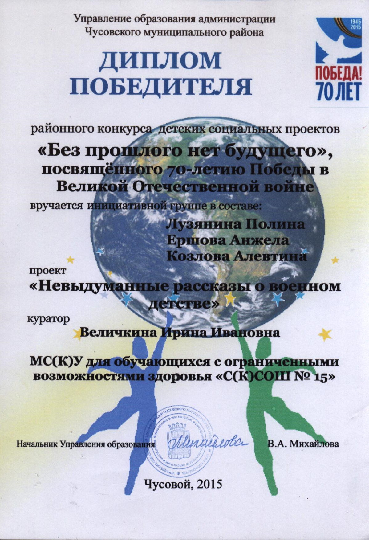 В мае 2015 г мы приняли участие в конкурсе детских социальных проектов «Без прошлого нет будущего». Наш проект назывался «Невыдуманные рассказы о военном детстве» - и являлся посильным вкладом в подготовку к празднованию 70-годовщины Великой Победы, данью глубокого уважения и благодарности целому поколению – поколению детей войны. Проект «Невыдуманные рассказы о военном детстве» был нацелен на сбор и опубликование материала о военном детстве наших родственников, родственников учителей и большинства обучающихся нашей школы. Мы с обучающимися класса, в котором я являлась классным руководителем, провели поисковую работу детей войны. Согласно Федерального закона Российской Федерации к категории детей войны относятся граждане Российской Федерации, родившиеся в период с 22 июня 1927 года по 3 сентября 1945 года, постоянно проживавшие на территории Союза Советских Социалистических республик в годы Великой Отечественной войны. К данной категории не относятся лица, отбывавшие наказание в местах лишения свободы в этот период.