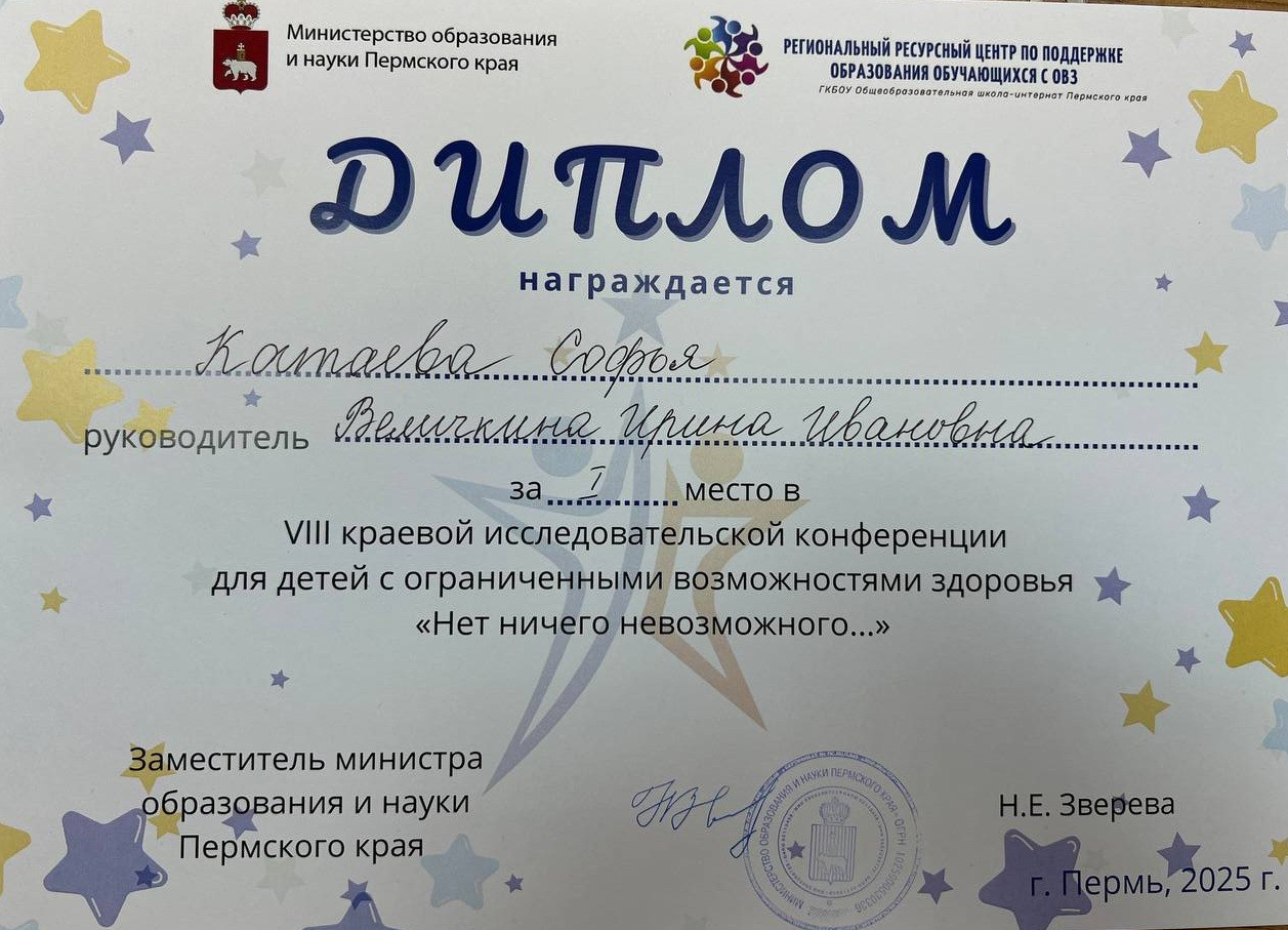 С результатами, наработанными по реализации этого проекта обучающаяся нашей школы приняла участие в VIII краевой исследовательской конференции для детей с ограниченными возможностями здоровья "Нет ничего невозможного...", где заняла (1 место).