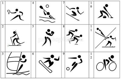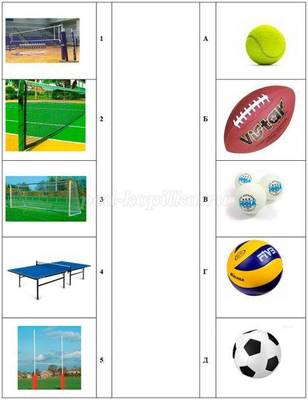 А.Подчеркните инвентарь, который использует биатлонист? 1.Лыжи 2.Винтовка 3.Коньки 4.Сноуборд 5.Палки 6.Шайба 7.Клюшка Б.Подчеркните инвентарь, который использует футболист? 1.Мяч 2.Седло 3.Бита 4.Ворота 5.Перчатки 6.Ракетка 7.Копье В.Отметьте пять видов спорта связанные с водой. 1.Фехтование 2.Водное поло 3.Теннис 4.Конный спорт 5.Футбол 6.Гимнастика 7.Борьба 8.Гребля 9.Плаванье 10.Лёгкая атлетика 11.Синхронное плаванье 12.Тяжелая атлетика 13.Прыжки в воду Г.Для каких видов спорта нужен лёд? Отметьте их. 1.Хоккей 2. Сноубординг 3.Фигурное катание 4.Биатлон 5.Лыжные гонки 6.Скелетон 7.Горные лыжи 8.Двоеборье 9.Фристайл 10.Кёрлинг 11.Прыжки с трамплина 12.Бобслей 13.Санный спорт
