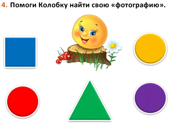 -Где же фотография колобка? (желтый круг). Верно. Виолетта, иди к доске, соедини колобка и его фотографию.