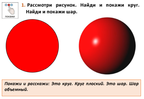 - Откроем рабочие тетради. Смотрим на картинку. Покажем круг. Молодцы. Ваня скажи: «Это круг. Он плоский». Молодец Ваня. Возьмите круг и прижмите круг ладонью к парте.