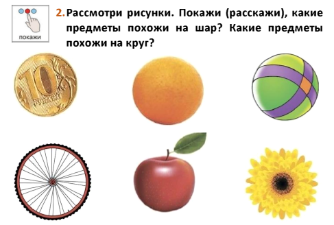 - Смотрим на следующую картинку. Назовем предметы на картинке и скажем, похожи на круг или на шар.