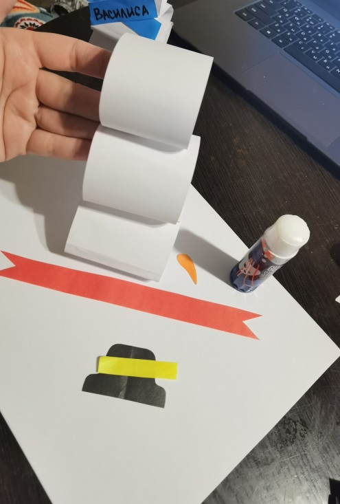 - Учить детей из прямоугольника, путем склеивания получать цилиндр, вырезать по шаблону части для снеговика, закрепить приемы работы с ножницами.