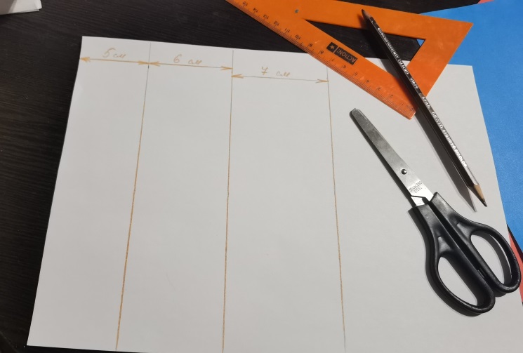 1. С помощью линейки и карандаша на листе белой бумаги делаем отметки шириной 5см, 6 см, 7 см. соединяем и разрезаем полоски.