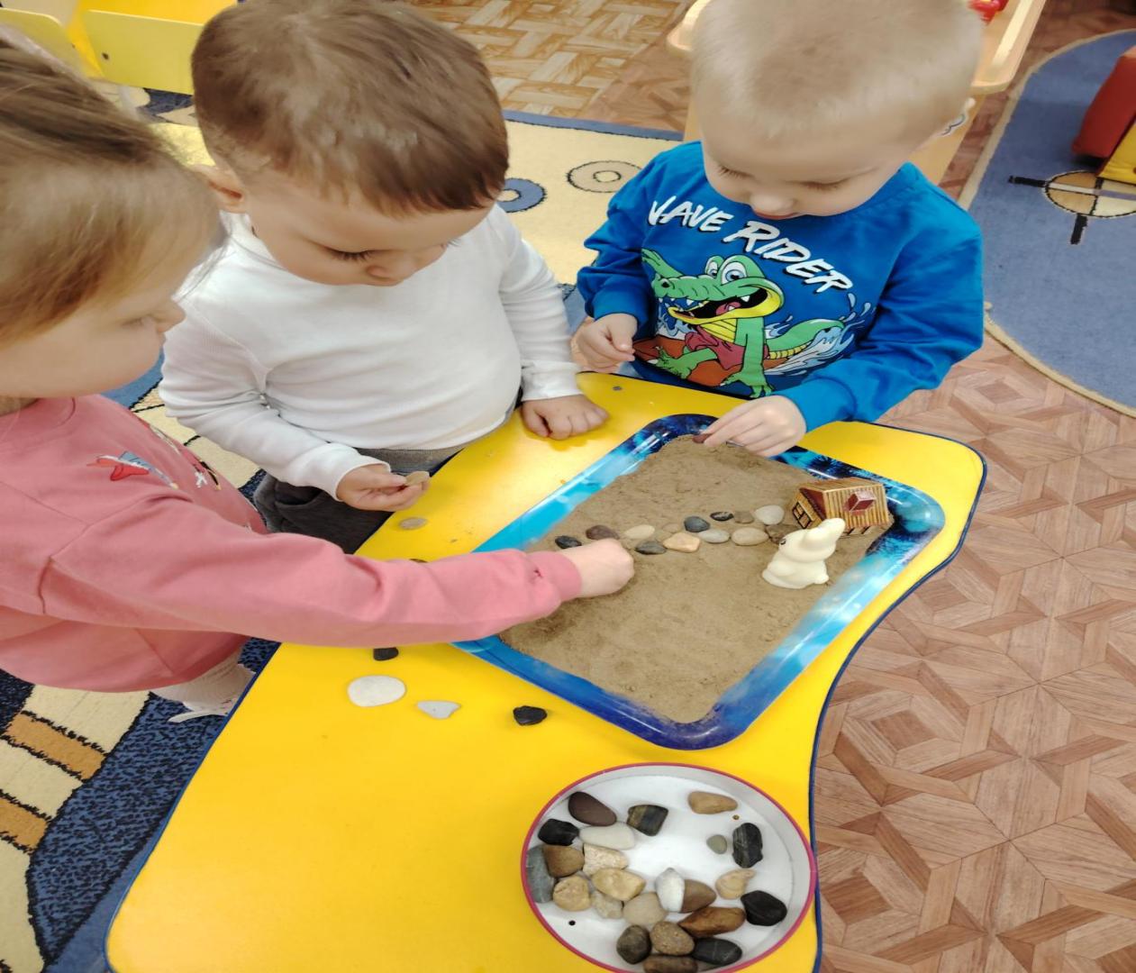 Зайчик : Наверное, подул сильный ветер, и песочек спрятал камешки. Ребята, давайте поищем их в песочке.