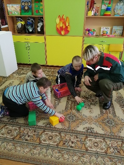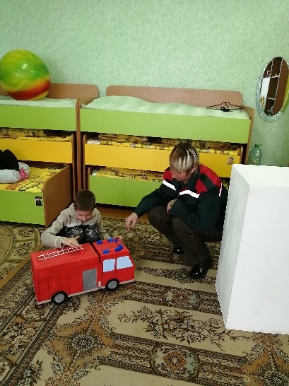 Пожарный: здравствуйте ребята! Прибыл я к вам из пожарной части, рассказать о своей работе. Работа наша не простая – для того, чтобы бороться с огнём нужно быть сильным, смелым, ловким, быстрым. Ребята хотели бы побывать в роли Пожарных?