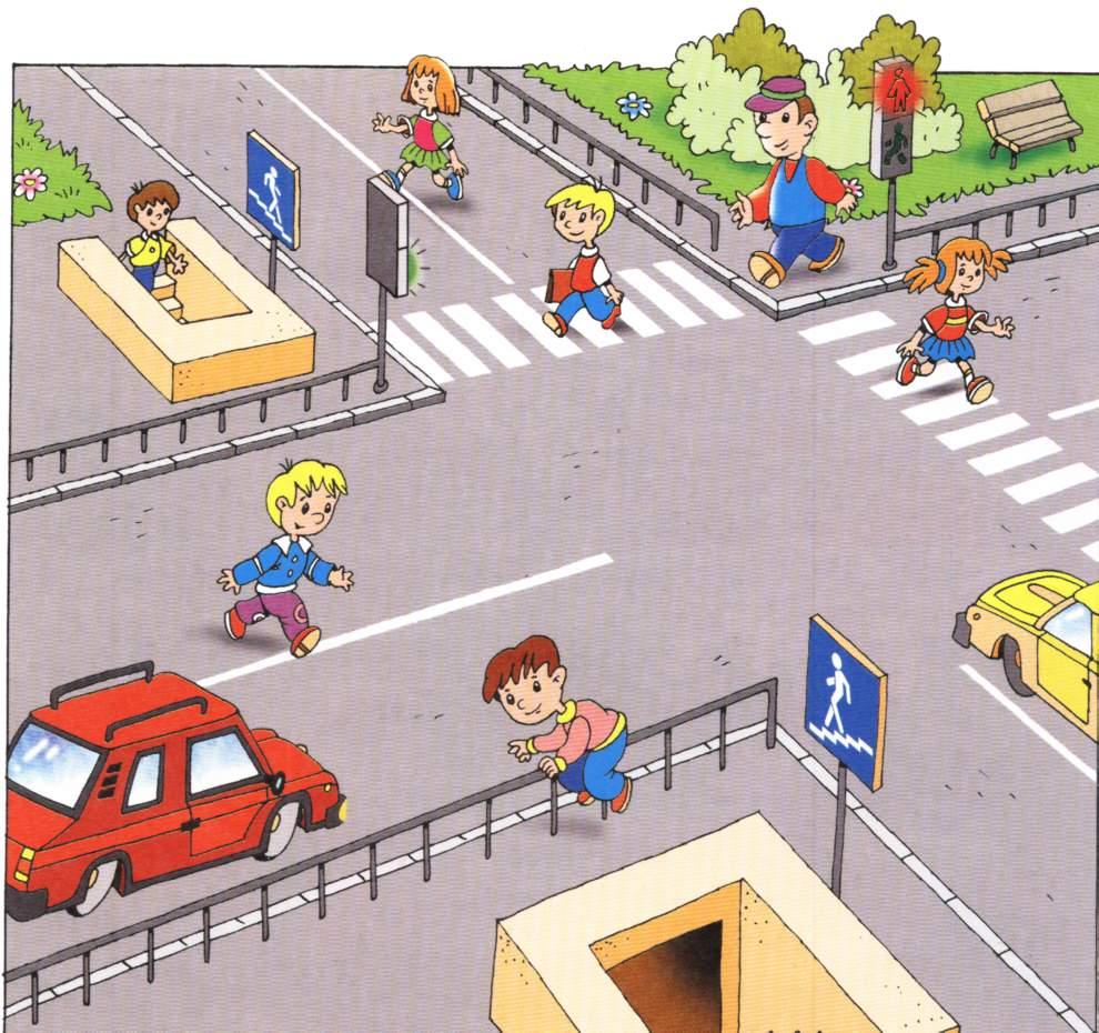 2.3 Обе девочки переходят дорогу неправильно - одна на запрещающий сигнал, другая не по пешеходному переходу, Мальчик перед красной машиной переходит дорогу в запрещенном месте - ему надо либо спуститься в подземный пешеходный переход, либо по пешеходному переходу по сигналам светофора. Мальчик играет на ограждении(балуется, перелазит) - это не позволительно.