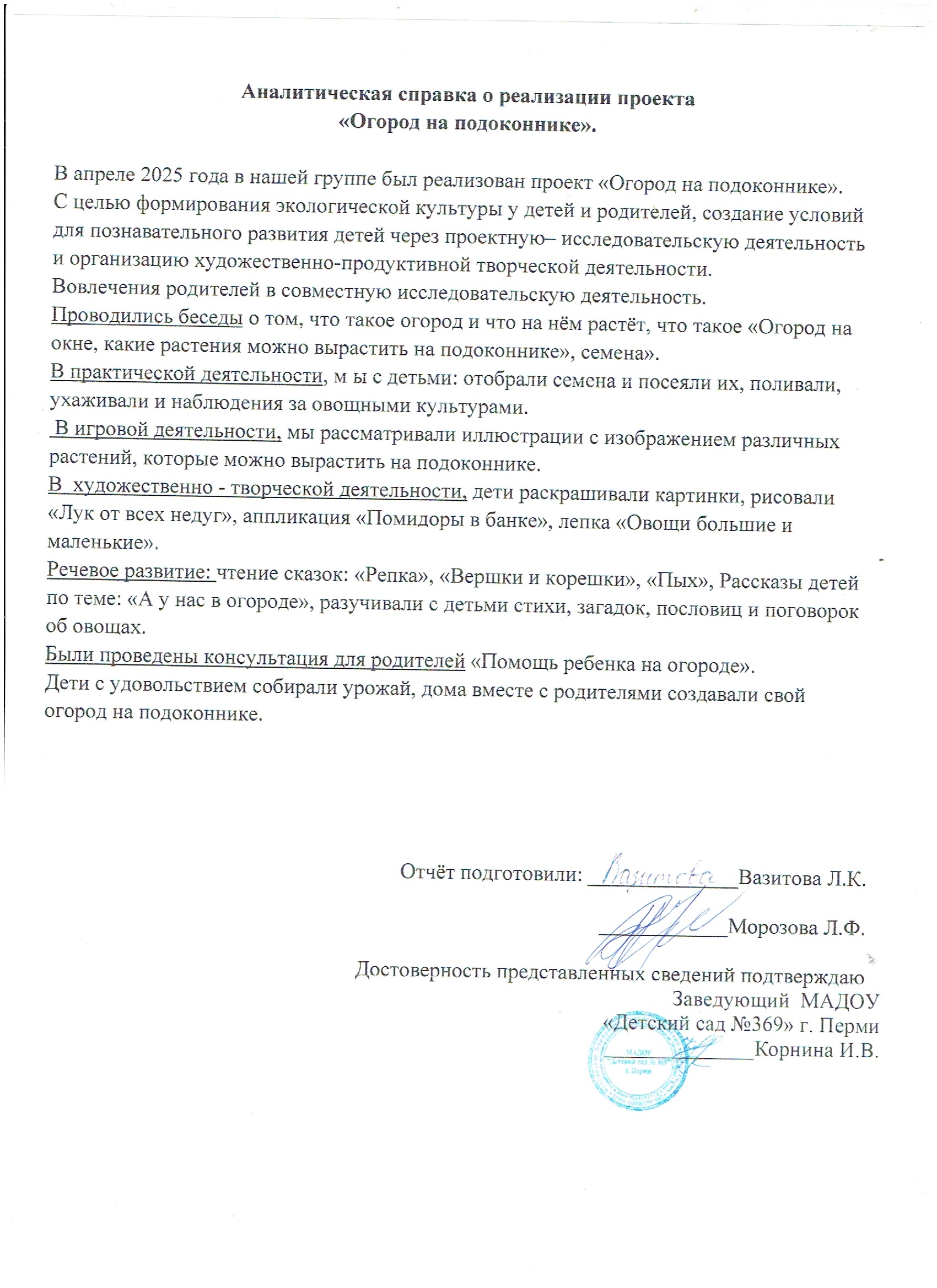 Основные этапы и направления реализации цели проекта: Подготовительный этап Деятельность педагога: • Беседы с детьми (выявление уровня знаний о растениях). • Составление плана работы над проектом. • Сбор материала необходимого для реализации проекта. • Чтение художественной литературы (потешек, пословиц, поговорок, песен, связанных с огородом и овощами). • Организация предметно – развивающей среды по теме проекта. • Изготовление дидактических игр и пособий. Деятельность детей: • Рассматривание иллюстративного материала, муляжей овощей по теме проекта. Взаимодействие с семьей. • Сбор необходимого материала для создания огорода. • Совместное обсуждение мероприятий по выполнению проекта. Практическая работа Деятельность педагога: • Беседа с детьми познавательного характера. • Организация предметно – развивающей среды по теме. • Подготовка информации для родительских уголков. Деятельность детей: • Посадка семян томатов, салата, лука, укропа в землю. • Уход за растениями - полив, рыхление, прореживание, пикирование томатов. • Выполнение заданий в самостоятельных наблюдениях. • Игровая, двигательная деятельность. • Участие в практической деятельности. • Лепка овощей из пластилина. • Отгадывание загадок про овощи и фрукты. Совместная деятельность взрослых и детей: • Рассказы воспитателя, чтение детской художественной литературы. • Различные виды изобразительной деятельности по тематике. • Сбор коллекций семян. • Рассматривание дидактических картинок, иллюстраций об овощах. • Труд в огороде. Подведение итогов Деятельность педагога: • Итоговая беседа с детьми (анализ проделанной работы). Деятельность детей: • Участие в итоговой беседе о проделанной работе. Мероприятия по реализации проекта 1. Беседы: • «Что такое огород и что на нём растёт», • «Что такое «Огород на окне», • «Какие растения можно вырастить на подоконнике», • «Семена». 2. Практическая деятельность: • Отбор и посев семян. • Полив, уход и наблюдения за овощными культурами. 3. Игровая деятельность: • Рассматривание иллюстраций с изображением различных растений, которые можно вырастить на подоконнике. • Рассматривание различных семян. • Сюжетно - ролевая игра «Овощной магазин». 4. Художественно - творческая деятельность детей. • Раскрашивание картинок. • Рисование «Лук от всех недуг». • Аппликация «Помидоры в банке». • Лепка «Овощи большие и маленькие». 5. Речевое развитие. • Чтение сказок: «Репка», «Вершки и корешки», «Пых». • Рассказ детей по теме: «А у нас в огороде». • Разучивание с детьми стихов, загадок, пословиц и поговорок об овощах. 6. Консультация для родителей «Помощь ребенка на огороде». Предполагаемое распределение ролей в проектной группе Воспитатель: занимается подбором нужного материала, организует образовательные ситуации (посадка культур), эффективно развивает творческое и познавательное мышление детей дошкольного возраста, и привлекает родителей воспитанников для пополнения развивающей среды группы и знаний дошкольников. Дети: участвуют в познавательной деятельности, занимаются наблюдением за прорастанием огородных культур. Родители: приобрели землю, семена, материал для ухода за посадками.