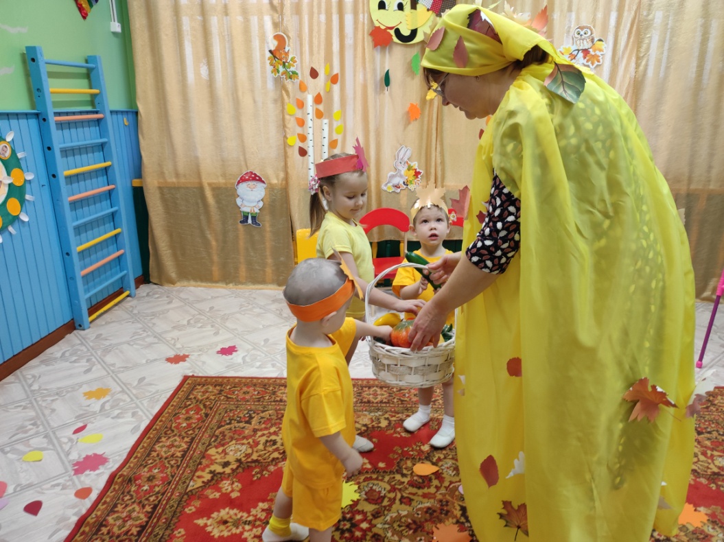 В гости к детям приходит Осень. Дети поют песенки и читают стихотворения для Осени. Осень играет, танцует с детьми. В конце праздника угощает детей гостинцами!