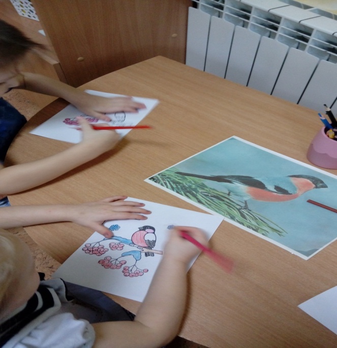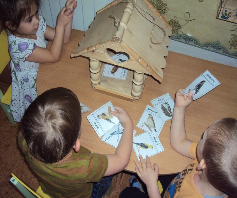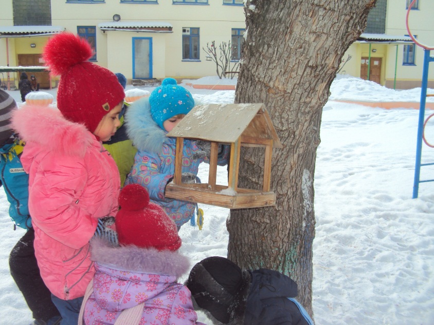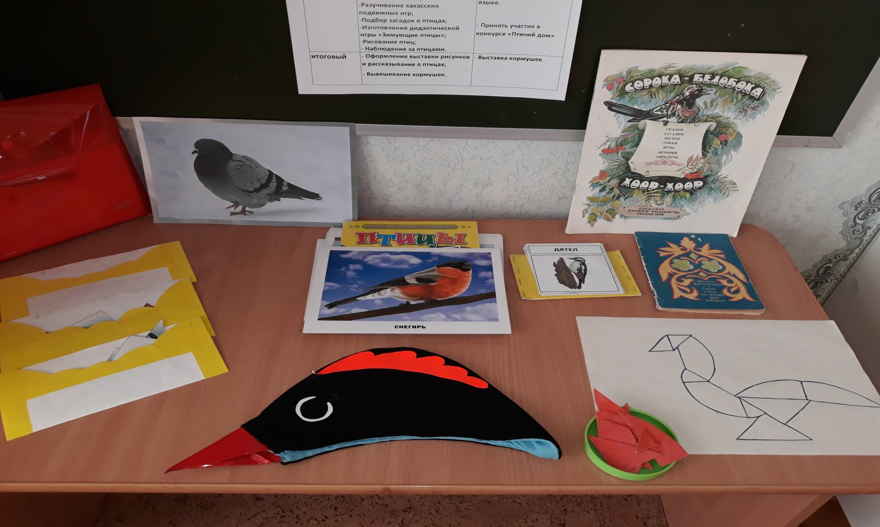| I этап - Подготовительный - Определение уровня знаний детей о зимующих птицах. - Определение темы проекта, задач, стратегий и механизмов. - Подбор необходимой литературы по данной теме. - Перспективное планирование проекта. - Разработка и накопление методических материалов по проблеме. II этап - Основной (практический) Сотрудничество с родителями Домашние задание родителям: рекомендации на совместные прогулки по наблюдению за зимующими птицами нашего края, пополнению птичьих столовых. Заучивание стихотворений о зимующих птицах. Отгадывание загадок про зимующих птиц. Рассмотреть зимующих птиц на иллюстрациях в книгах и журналах, принести книги в детский сад. Предложить участие в конкурсе «Птичий дом». Памятка для родителей «Покормите птиц зимой». Консультация «Зимующие птицы» Совместная деятельность с детьми. Игровая деятельность Дидактические игры: «Птички на кормушках», «Каких птиц зимой не увидишь», «Назови ласково», «Счёт птиц», «Четвертый лишний», "Угадай птицу по описанию" « Узнай по голосу», «Что едят птицы». Н/и «Домино» (птицы), «Разрезные картинки». Подвижные игры «Воробушки и кот», «Зимующие и перелетные птицы», «Воробушки и автомобиль», хакасские игры «Хызыл паар – снегири» «Тасха - Совушка» Познавательная деятельность: Тема: «Зимующие птицы» Цели: Создание условий для формирования представлений о зимующих птицах, о видах питания зимующих птиц. Развития речевой деятельности детей( знакомства с названиями птиц на хакасском языке: кок паар- синица, хызыл паар – снегири, тасха- сова, алас- дятел, параатай- воробей, саасхан- сорока). ФЭМП Тема: «Сколько птиц к кормушке нашей прилетело?» Презентация о зимующих птицах и их голосах Социально-коммуникативное развитие Беседы: «Как живут наши пернатые друзья зимой», «Кто заботится о птицах», «Пользу или вред приносят птицы?», «Меню птиц», «Как дети с родителями заботятся о птицах зимой?». Решение проблемной ситуации: «Что может произойти, если не подкармливать птиц зимой». Труд: изготовление кормушек, чистка кормушек, подкормка птиц. Коммуникация: Чтение рассказов: И. Тургенева «Воробей», М. Горького «Воробьишко» + просмотр мультфильма, Н. Рубцова «Воробей» и «Ворона». Сухомлинского «О чём плачет синичка», просмотр мультфильма «Высокая горка», просмотр презентаций: "Зимующие птицы", "Кормушки". Заучивание и чтение стихотворений о зимующих птицах; обсуждение пословиц, поговорок, отгадывание загадок; рассматривание иллюстраций с изображением зимующих птиц. -Художественное творчество - «Снегири» и «Синички» (раскрашивание) – формировать умение передавать внешний вид снегирей. Ежедневное наблюдение на прогулках – наблюдение за погодой, как состояние погоды влияет на жизнь птиц. - наблюдение за кормушками детского сада - кто еще подкармливает птиц кроме нас. - наблюдение – за поведением птиц на кормушке, узнавать, называть, различать птиц (повадки). -наблюдение – кого мы не увидим на кормушке? В ходе проекта, у детей возникли вопросы: Почему ласточки не прилетают на кормушки? Для кого мы принесли этот корм? (сало, пшено, хлеб, сухая рябина, семечки) Почему необходимы кормушки разного размера? Также с детьми проводились ситуативные беседы: где уточнялось, какими знаниями они овладели: каких зимующих птиц они узнают? Зачем их кормят? Кто их подкармливает? Почему они сами себе не могу
