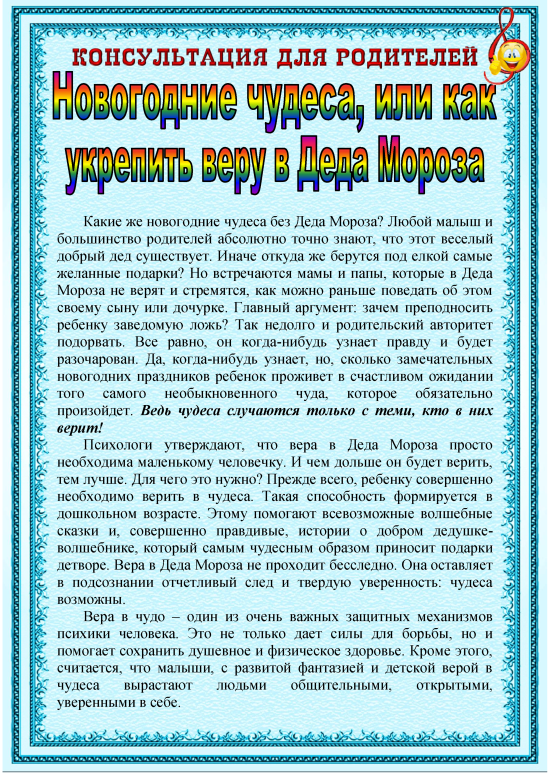 | Работа с родителями: Консультация «Новогодние чудеса, или как укрепить веру в Деда Мороза!» |