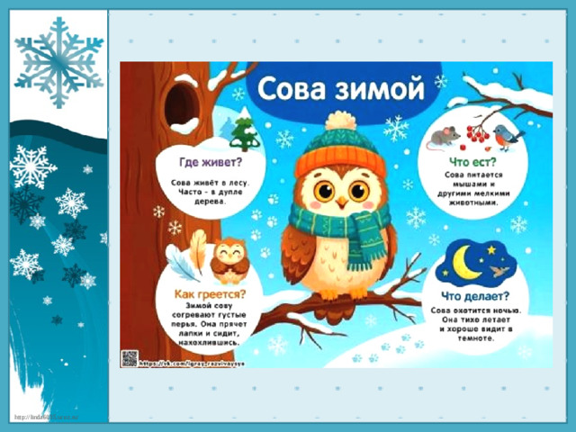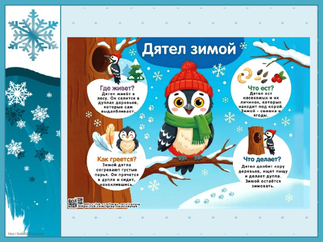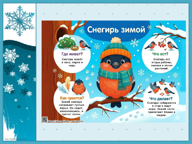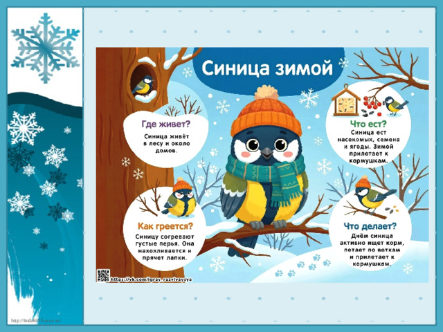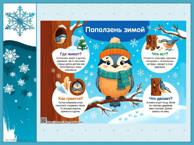В презентации представлены красочные картинки зимующих птиц.Содержание слайдов знакомит детей - где живет птица, что ест, как греется и что делает.