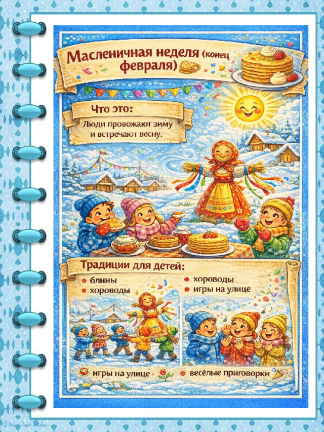 Содержание презентации знакомит детей дошкольного возраста с народным календарем февраля, знаменательными датами и праздником "Масленица".