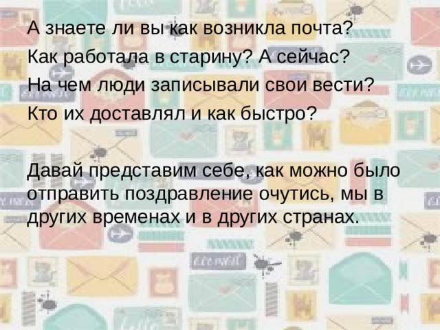 С глубокой древности люди хотели знать, что происходит на свете. Путников подробно расспрашивали: что делается в соседнем селении, в соседнем государстве? Если нужно было передать важное сообщение, то посылали гонца. Он прятал сообщение в одежде или заучивал наизусть. Тайну послания охраняли печати, которые одновременно служили знаком отправителя. Работа гонца была очень опасной. В дороге его могли подстеречь враги и разбойники, дикие звери.