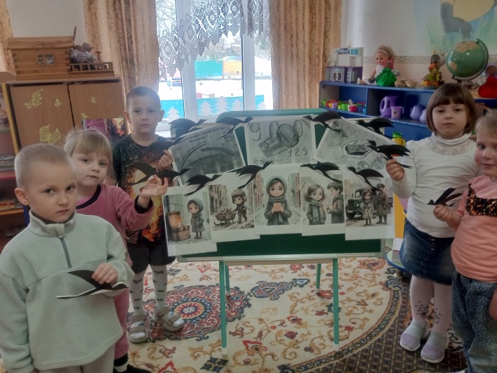– Ворона-ворона, – говорят дети. – Ты птица бесстрашная. Помоги нам. Написали мы два маленьких письмеца, отнеси их, пожалуйста, нашим близким: одно папе на фронт, второе бабушке и дедушке в дальнюю деревушку. Пусть знают, что хоть и тяжело нам, но мы держимся. Держимся и о них думаем: как они там? Живы ли? Здоровы ли?