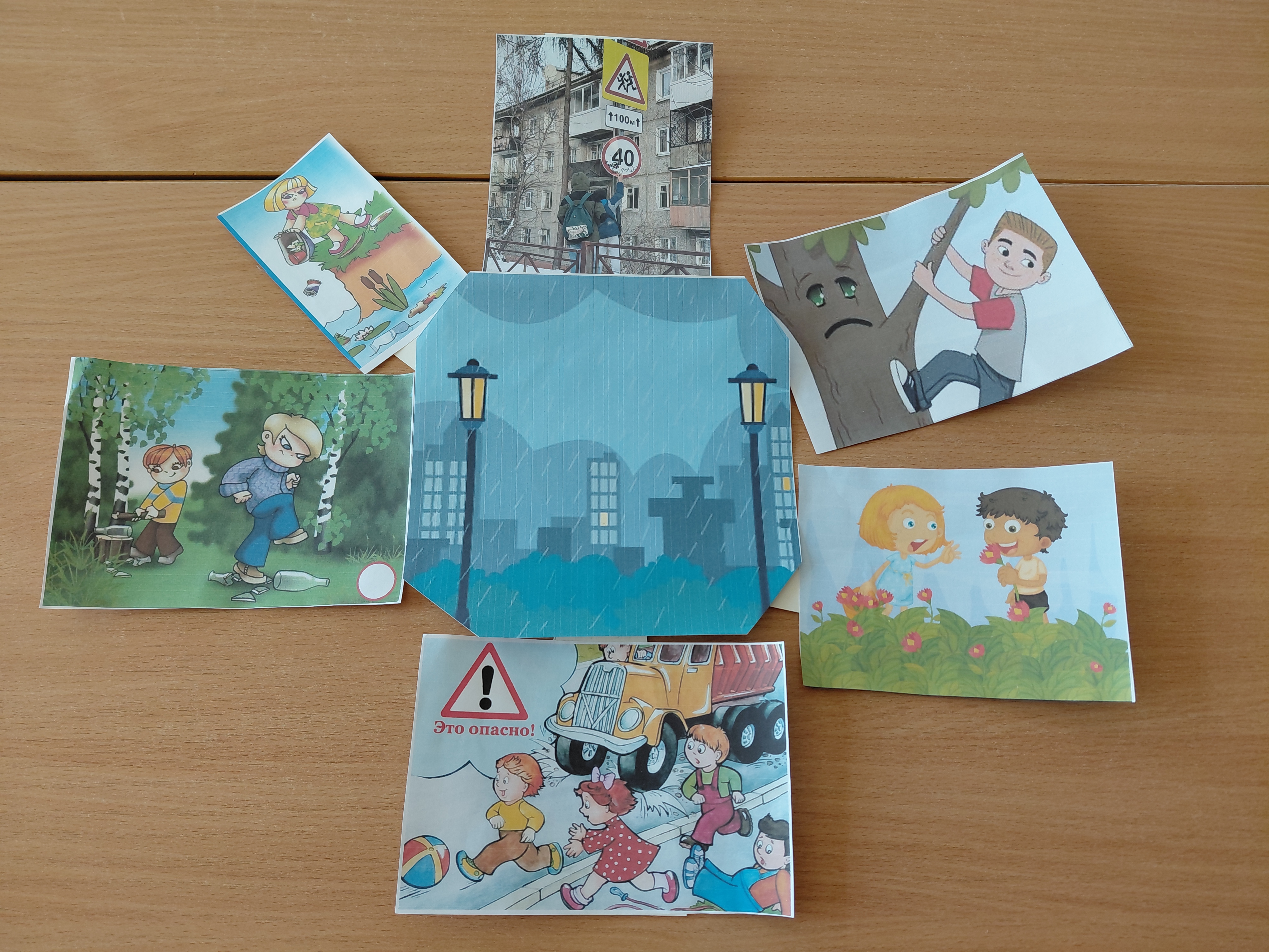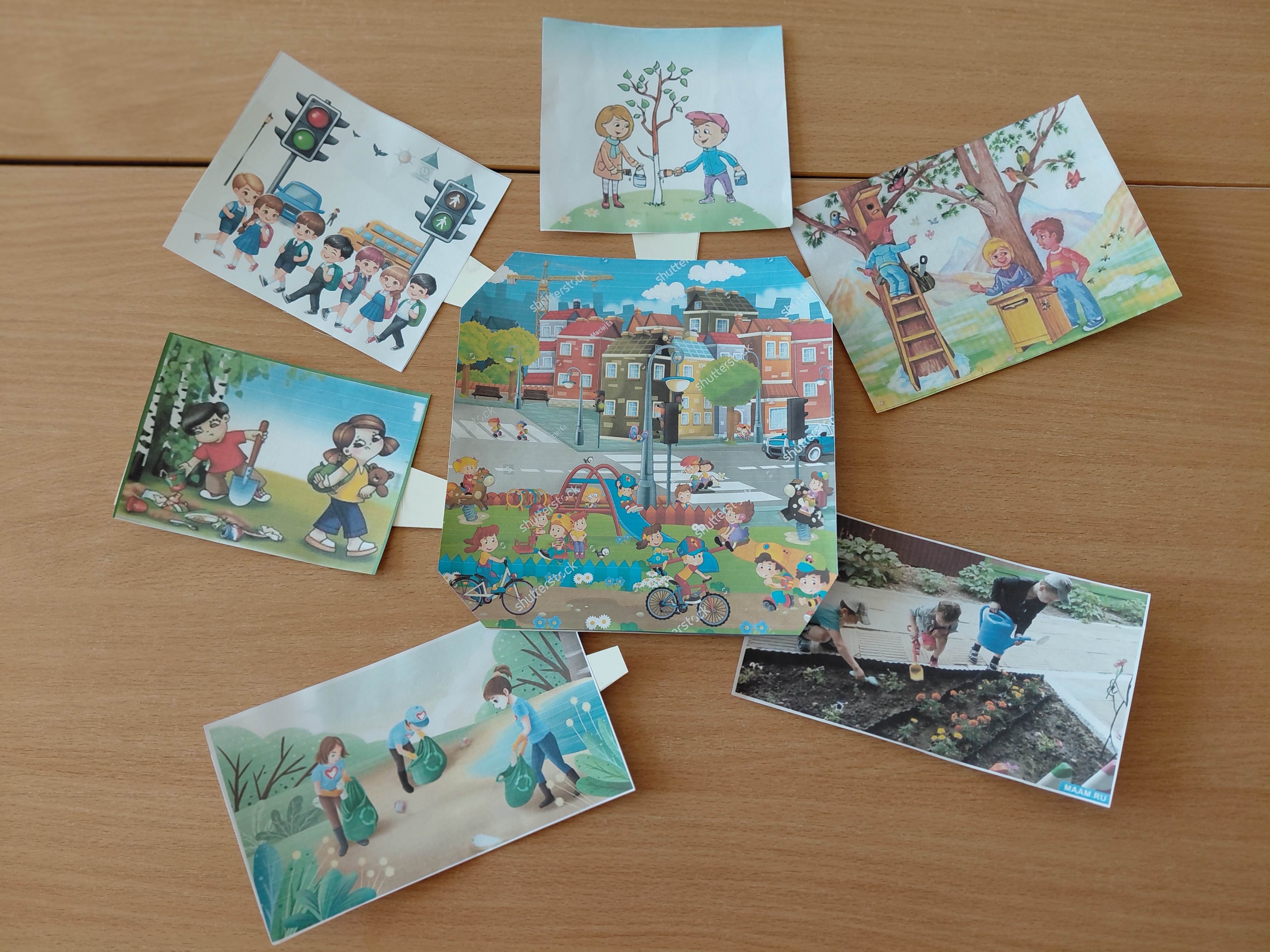 Предложить детям по очереди вытаскивать карточки -лепестки с поступками детей. Дети определяют по действиям на картинке когда город грустит, а когда улыбается.