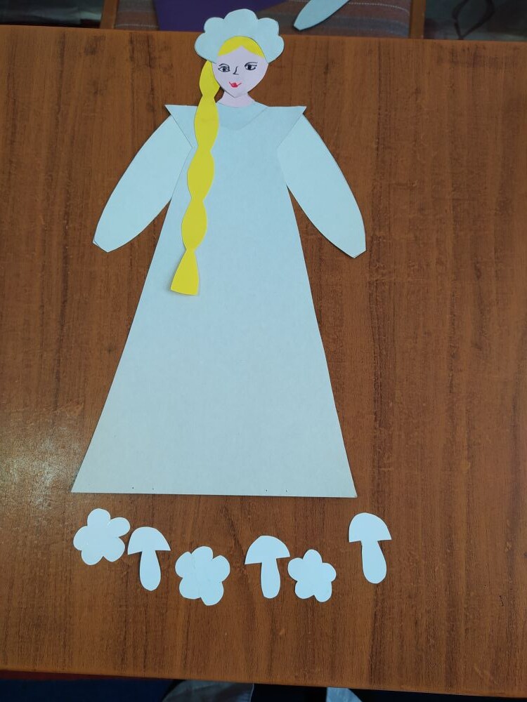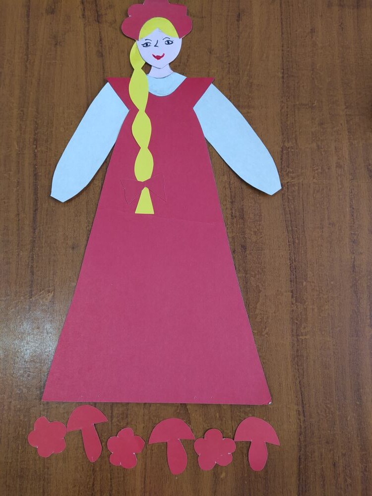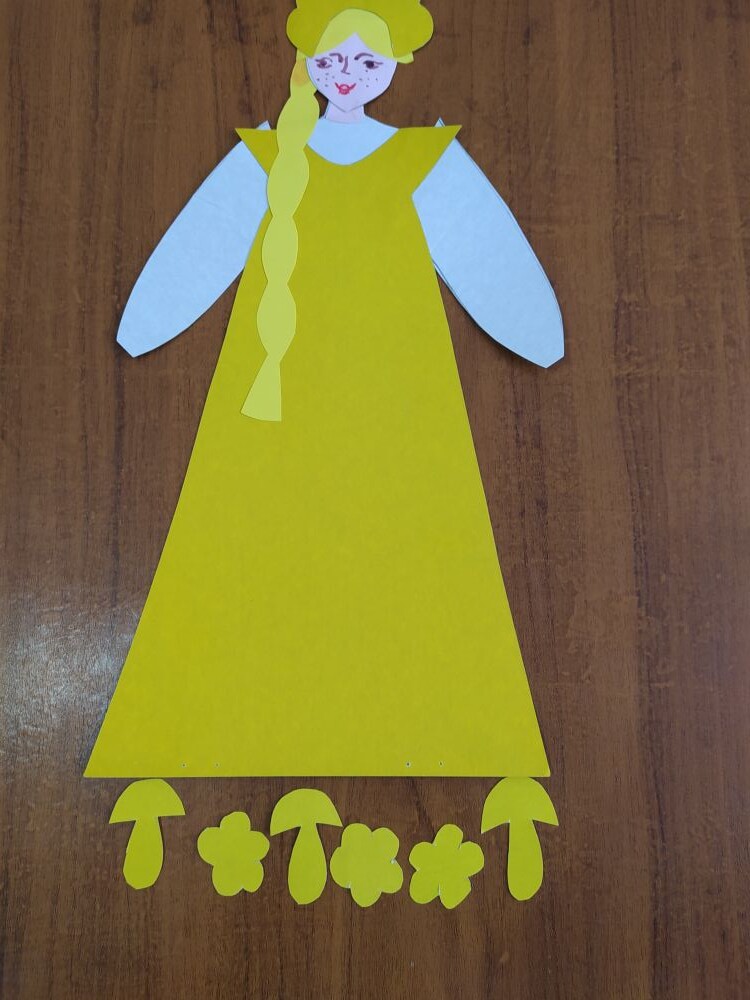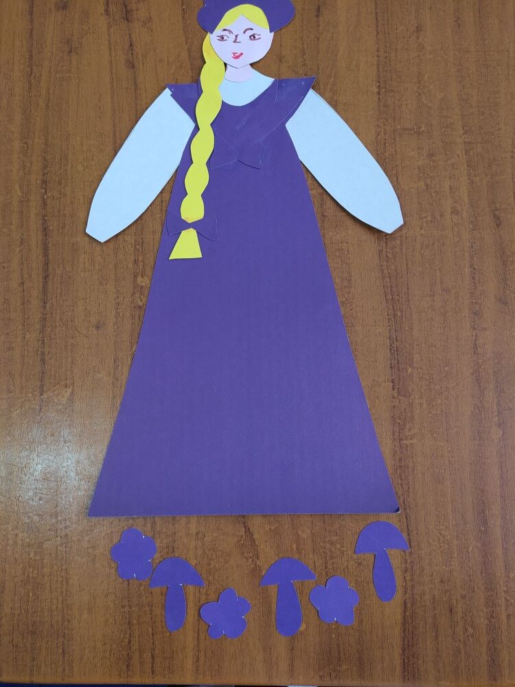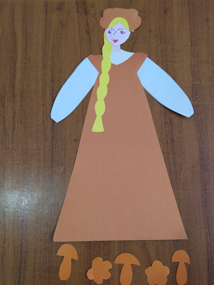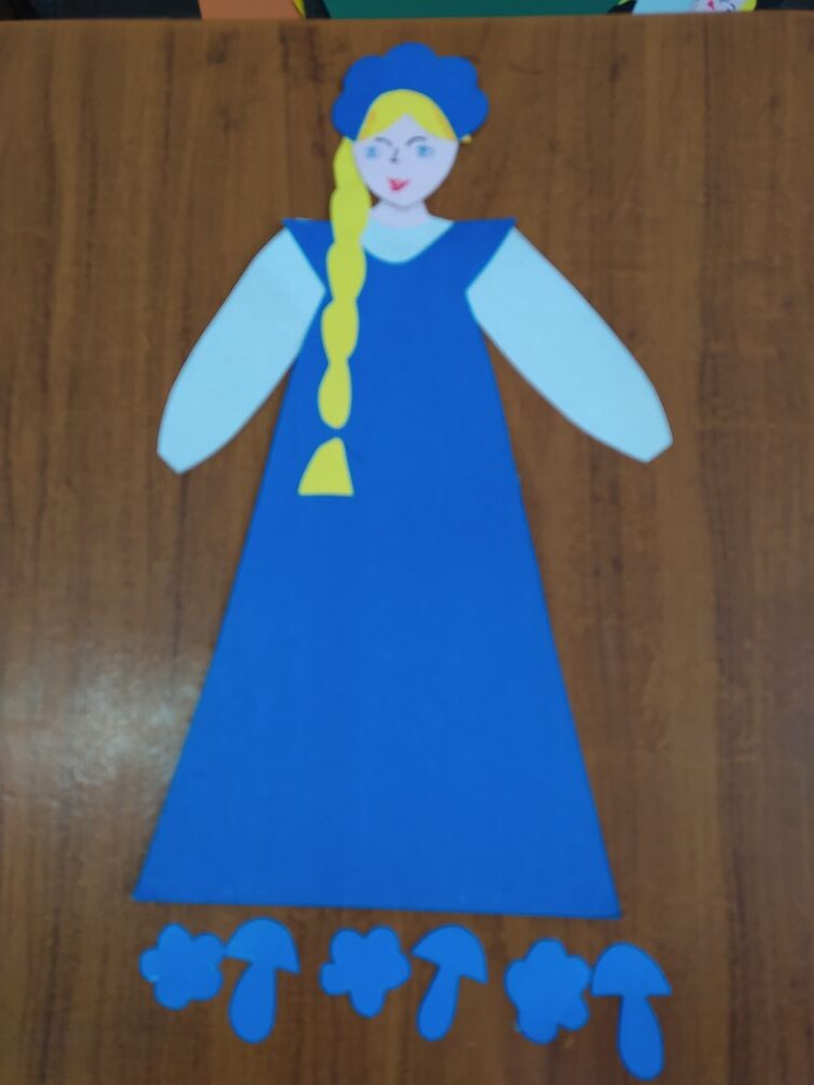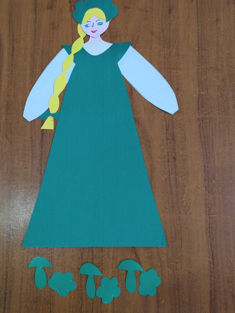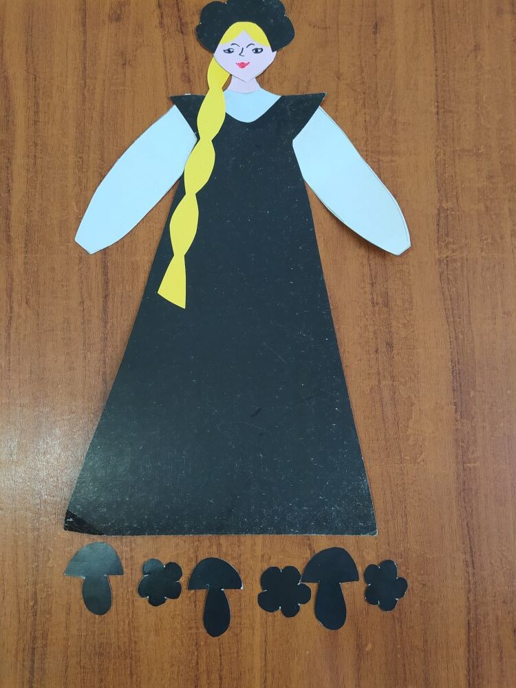 Материал: те же плоскостные куклы, что в предыдущей игре; изображения грибов и цветочков тех же цветов, что и куклы.