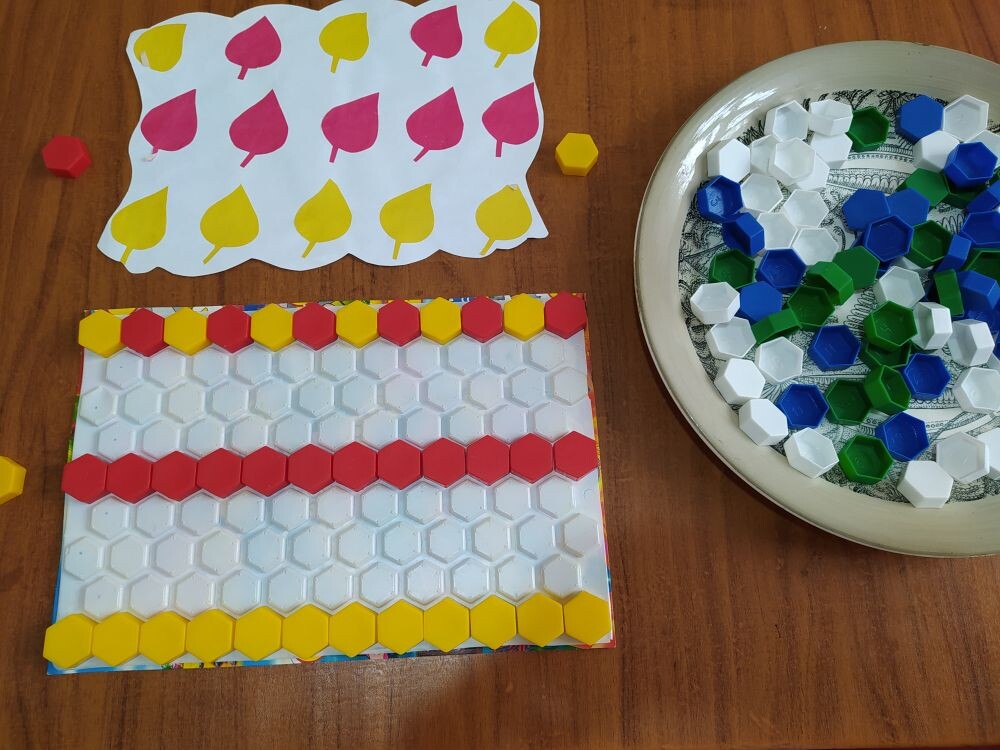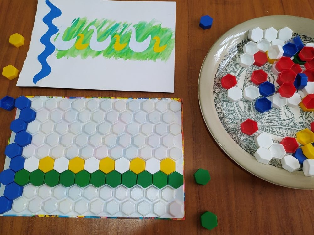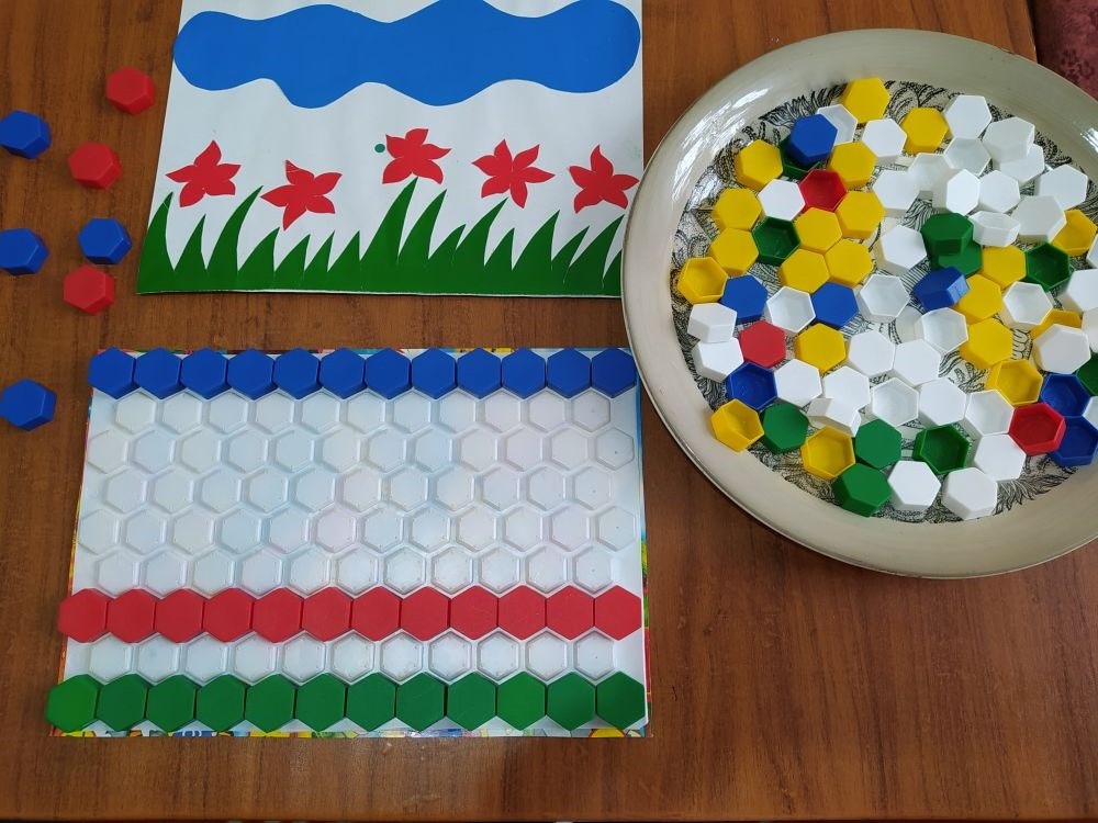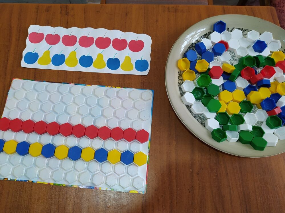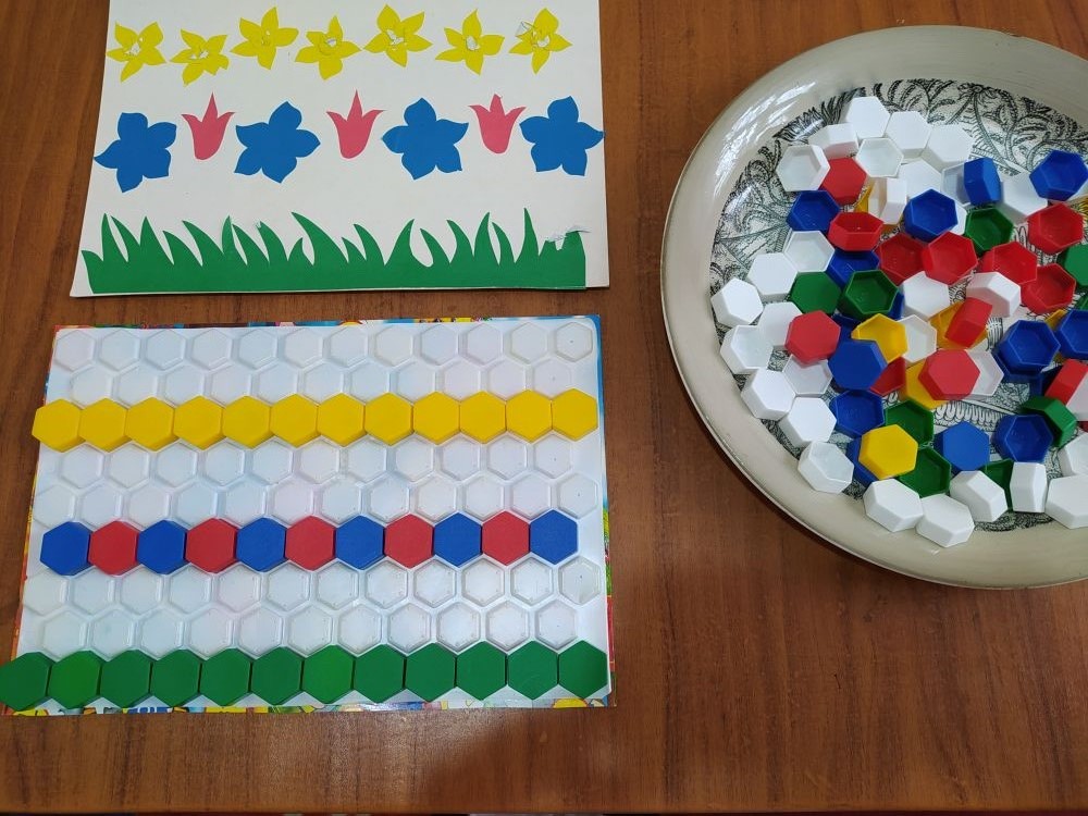 Цель: продолжать обучать ребенка самостоятельно выбирать заданный цвет мозаики из нескольких предложенных. Учить чередовать предметы по цвету.