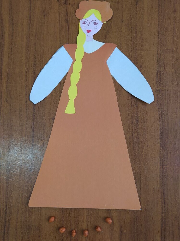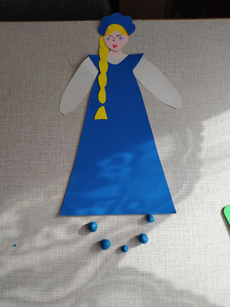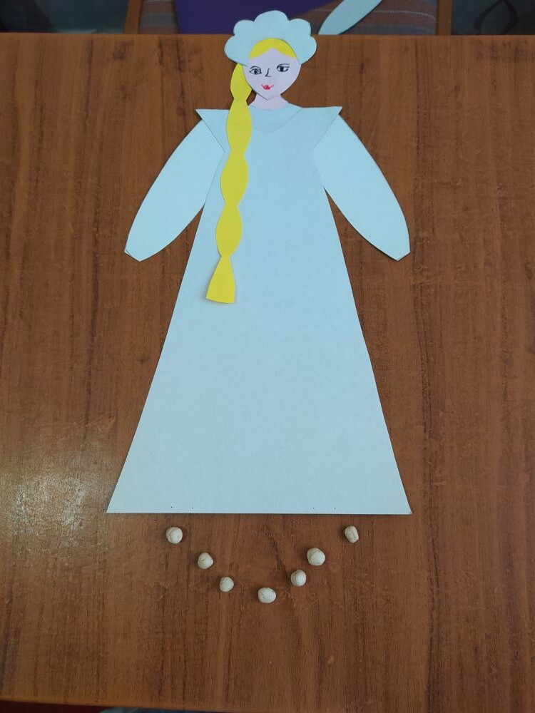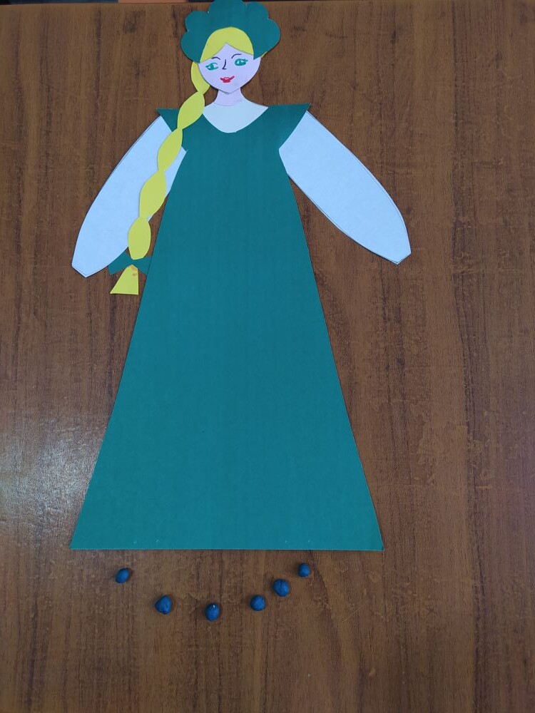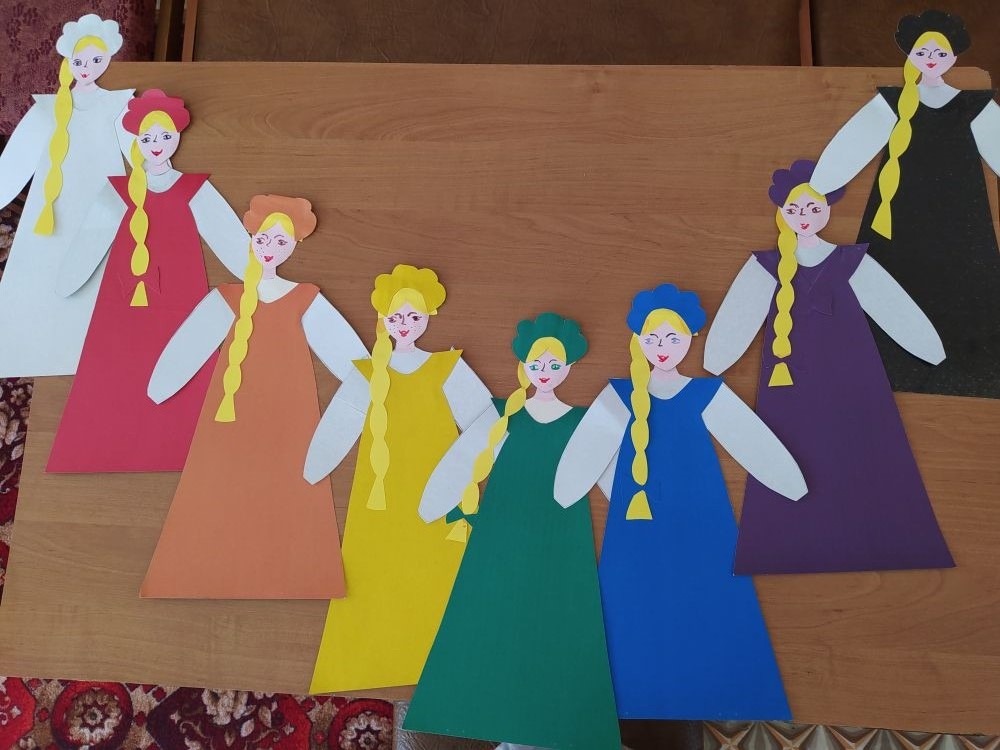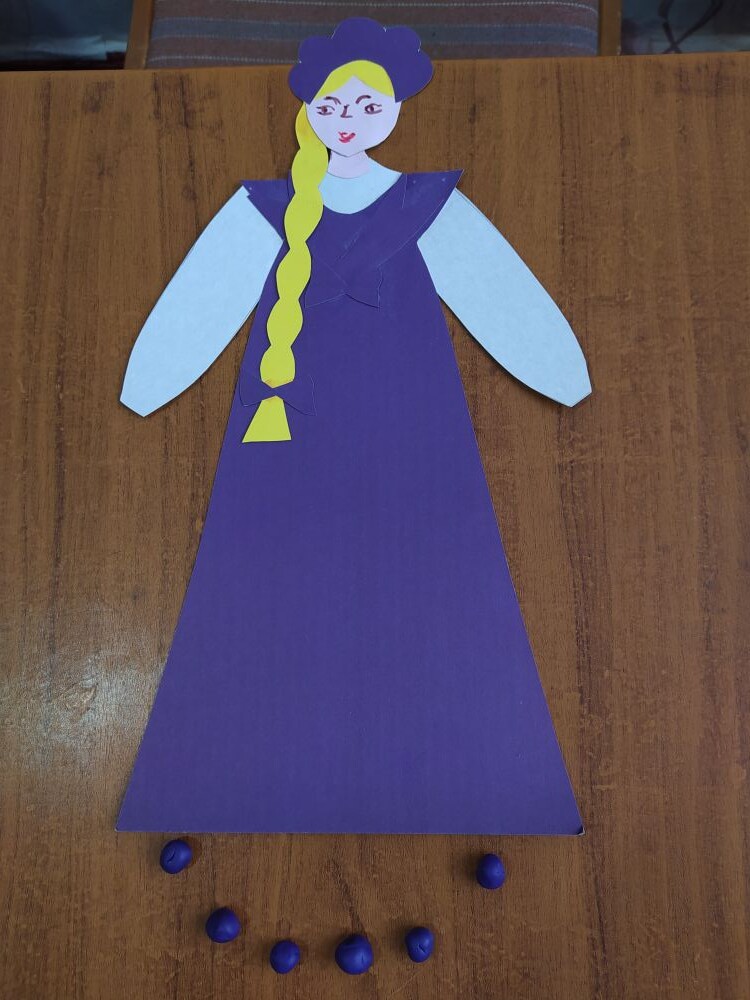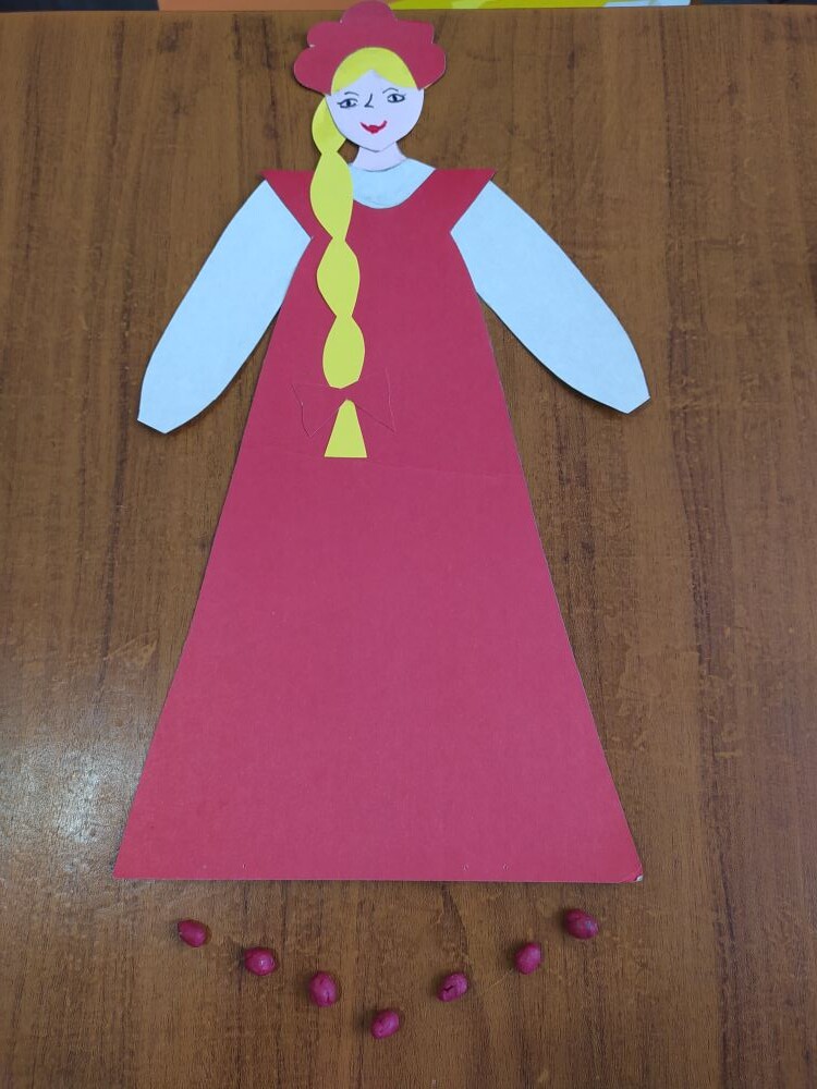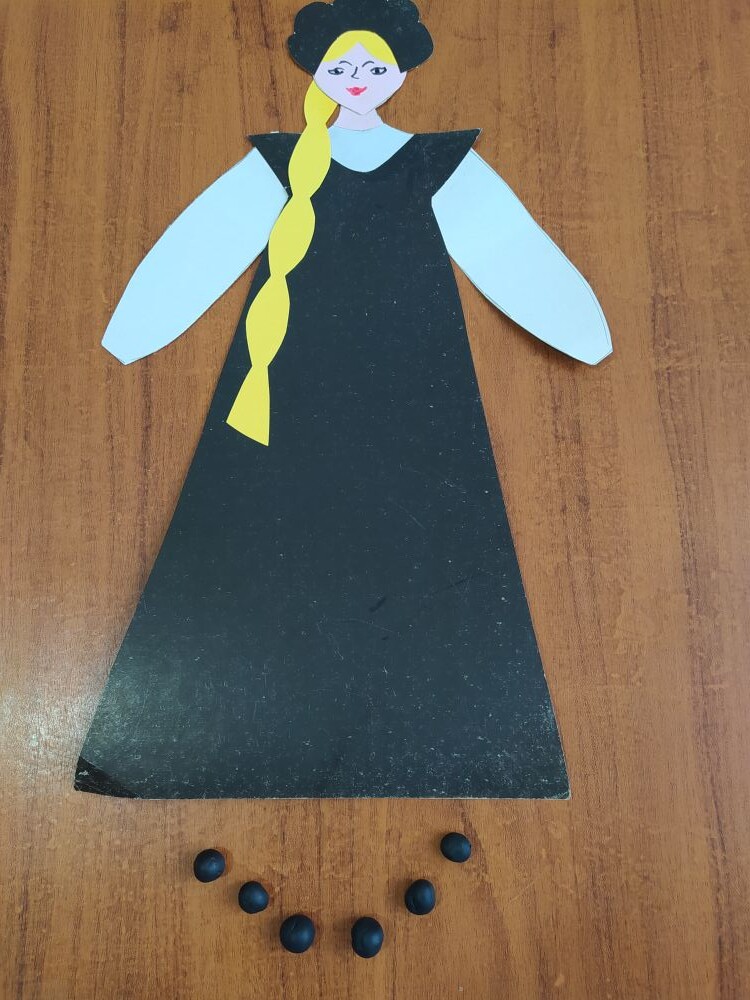 Материал: плоскостные изображения кукол 8-ми цветов (красный, оранжевый, желтый, зеленый, синий, фиолетовый, белый, черный); бусины (можно сделать из пластилина шарики; бумажные кружочки).