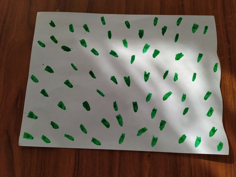 Педагог показывает картинку-изображение веточки с зелеными листочками, обращает внимание на разные цвета красок на столе и предлагает найти и показать, какой краской ребенок будет рисовать листочки. Затем дает кисть и просит его сделать вначале несколько мазков сухой кистью на бумаге. После предварительного упражнения в сухом примакивании, ребенок рисует краской. Учитель напоминает, что рисовать надо по всей поверхности листа, не накладывая мазки один на другой.
