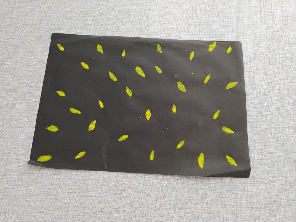 Педагог говорит о том, что вечером в окнах зажигаются огни. Затем показывает лист черной бумаги и наносит два мазка синей краской. Объясняет ребенку, что такого цвета огоньки ночью видны плохо. Далее взрослый наносит два зеленых мазка и спрашивает, хорошо ли видны огоньки такого цвета. Объясняет, что такого(зеленого) цвета огоньки тоже плохо видны ночью. Наносит два мазка красной краской и снова задает аналогичный вопрос (оказывается, что красные огоньки видны лучше, но не достаточно хорошо). Наконец, взрослый наносит два мазка желтой краской и все вместе приходят к выводу, что такого (желтого) цвета огоньки видны лучше всего. Затем ребенок получает розетки с краской 4-х цветов, и ему предлагают показать, какой краской он будет рисовать огоньки. Ему дают лист бумаги и предлагают самостоятельно нарисовать огоньки, акцентируя внимание ребенка на моменте прикладывания и отрыва кисти от бумаги. Педагог следит, чтобы ребенок наносил мазки по всей поверхности листа бумаги, не накладывая один мазок на другой.