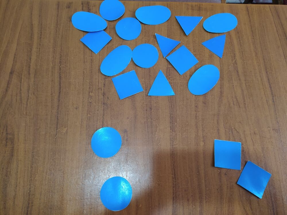 Материал: одинаковые по цвету, величине, фактуре круги, овалы, треугольники, квадраты, прямоугольники (каждой фигуры по 5 штук).
