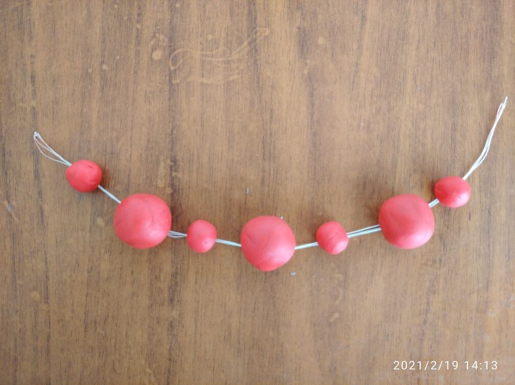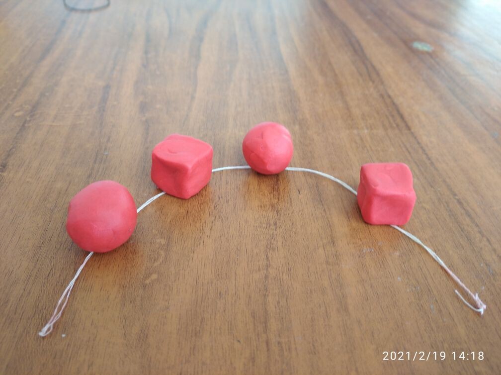 Материал: бусины разной формы (например, квадратные и круглые; можно сделать из пластилина) одинакового цвета и величины; шнурок.