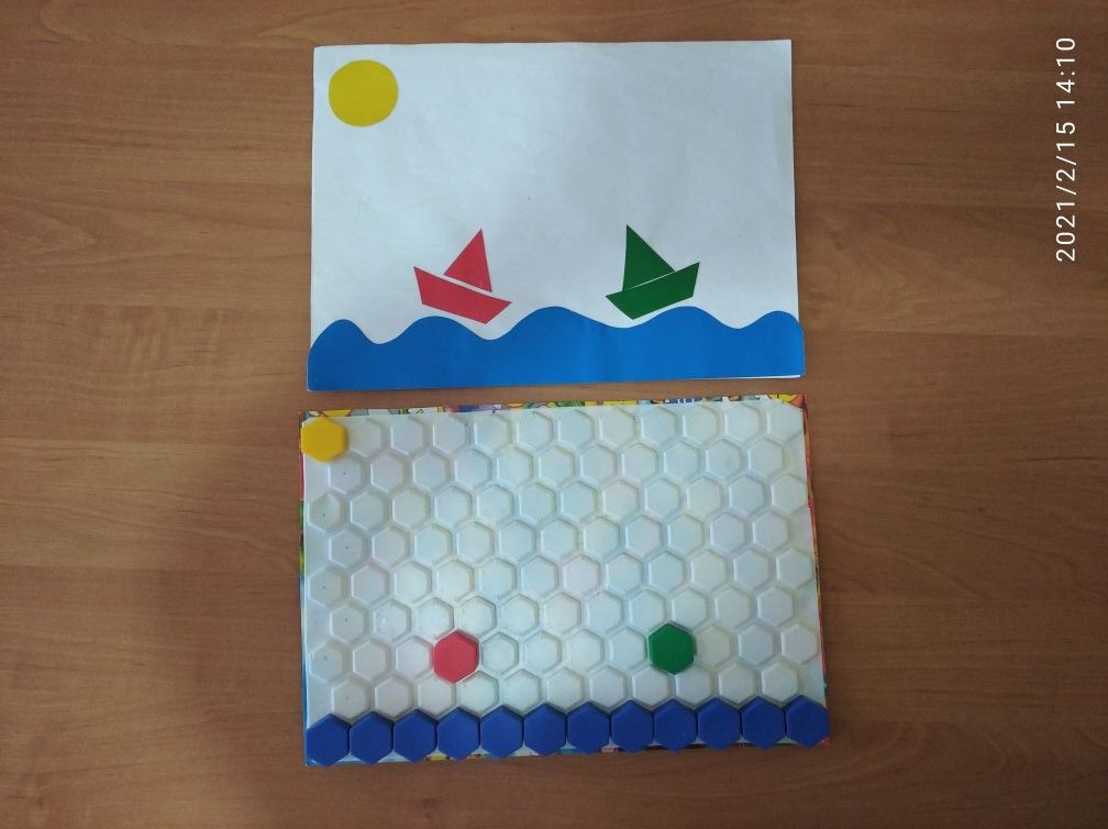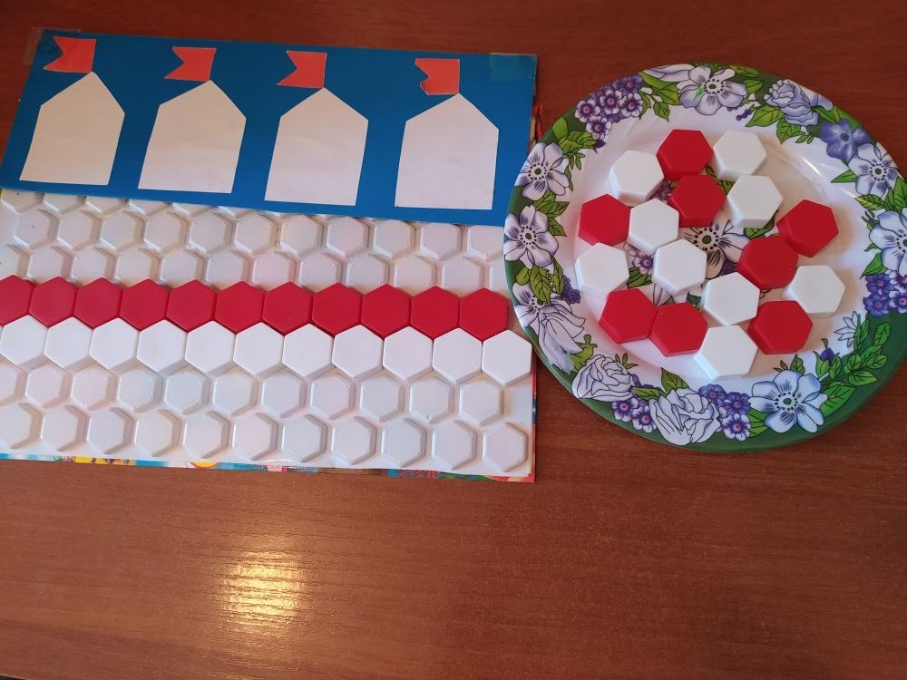 Материал: коробка (тарелочка) с мозаикой разных цветов. Но можно для облегчения задания в отдельную тарелочку положить только мозаику красного и белого цвета. Панель для выкладывания мозаики. Картинка-аппликация «Домики и флажки».