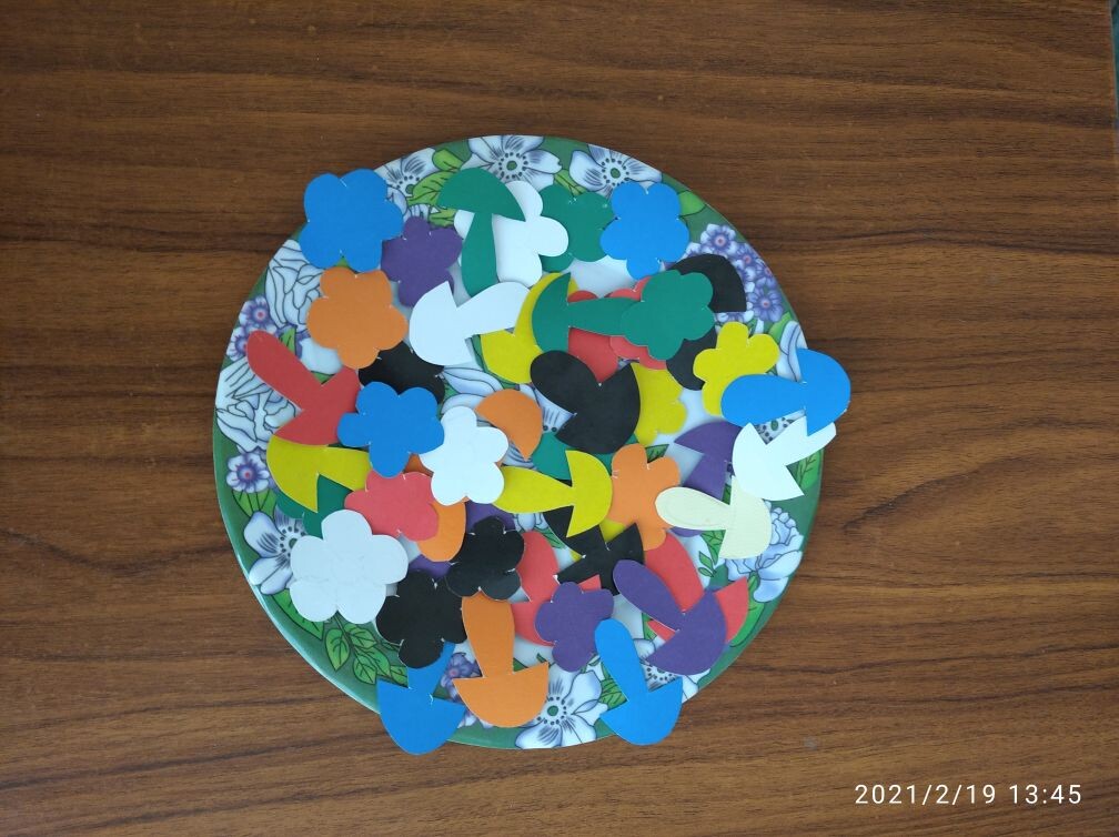 В течение занятия сочетания цветных предметов меняются и игра каждый раз повторяется снова. Например, сначала ребенок выбирал два заданных цвета: красный и желтый из 4-х предложенных (красного, синего, зеленого, желтого), то повторяя игру, можно дать новый цветной набор однородных предметов (оранжевый, фиолетовый, черный, белый) и предложить выбрать только два цвета: оранжевый и фиолетовый.