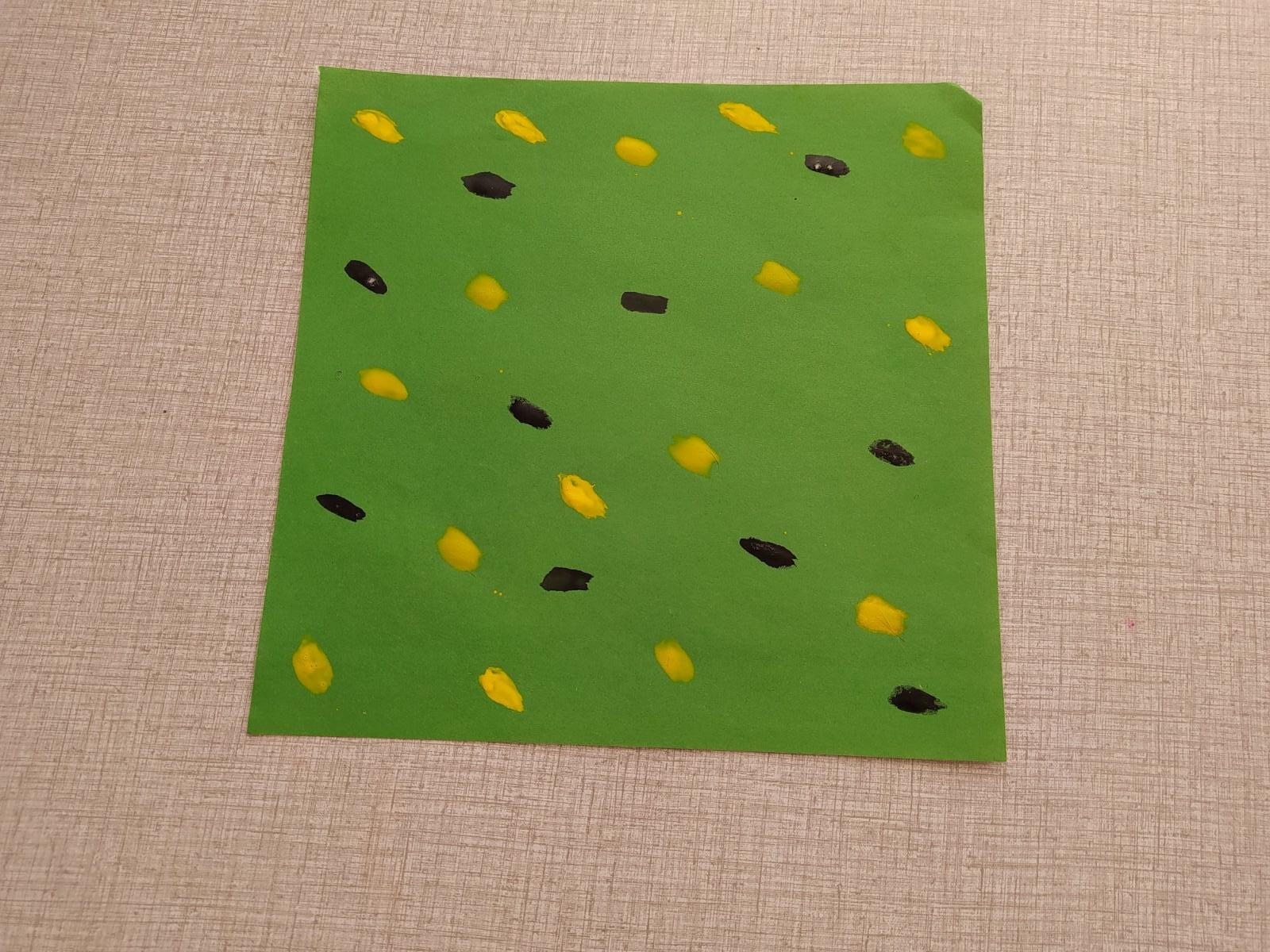 Перед ребенком размещают 4 краски, предлагают рассмотреть их, вспомнить и показать, какого цвета были на лугу одуванчики; затем найти и показать краску такого цвета, как жук. Затем учитель предлагает нарисовать одуванчики и жуков. При этом сначала ребенок рисует только одуванчики желтой краской, а потом ребенку дают чистую кисть, и он рисует жуков черной краской. При этом нужно уточнить, что жуков нужно рисовать между одуванчиками, а не на них, иначе краски сольются.